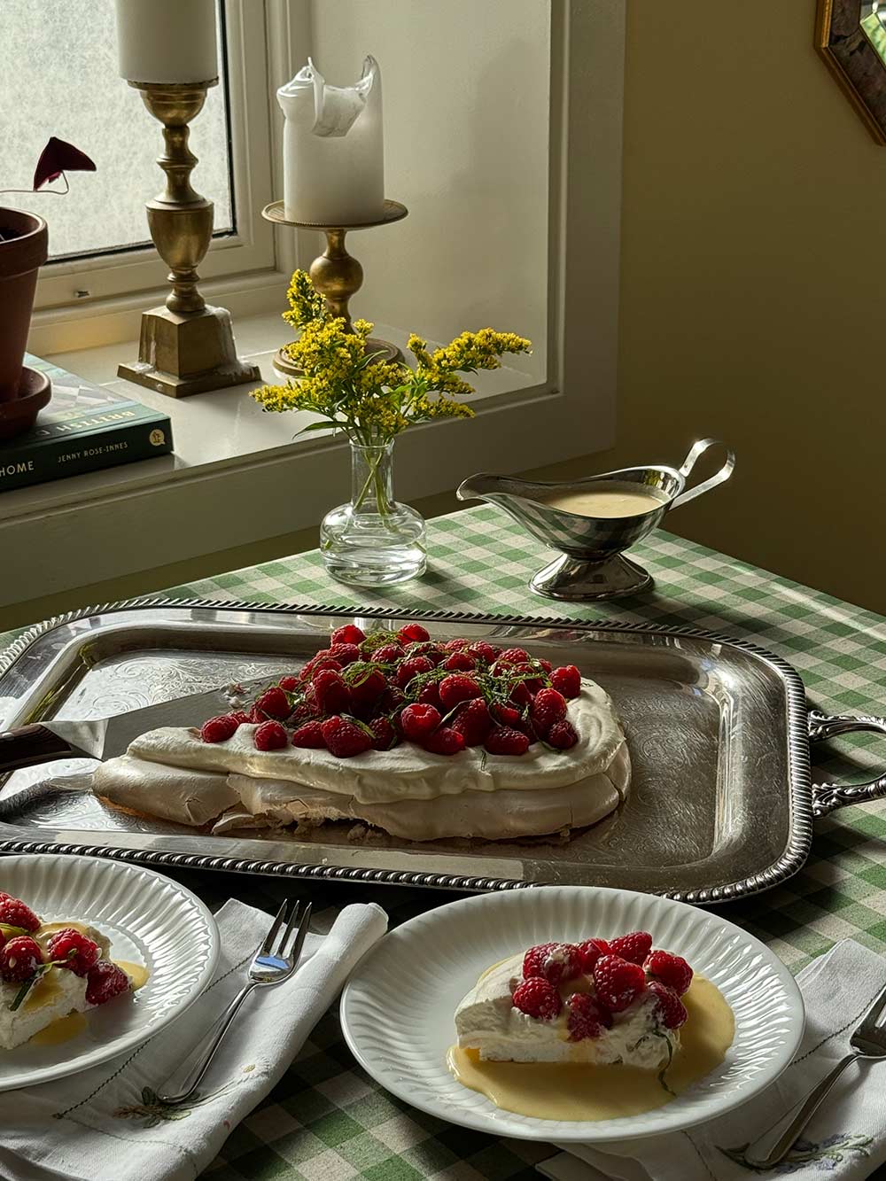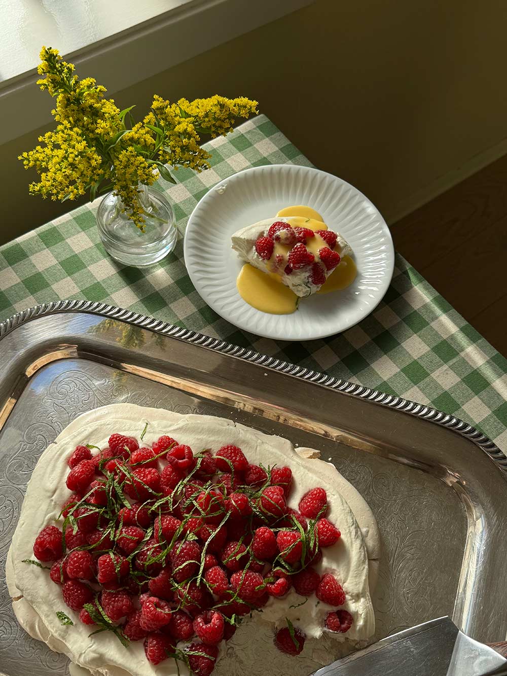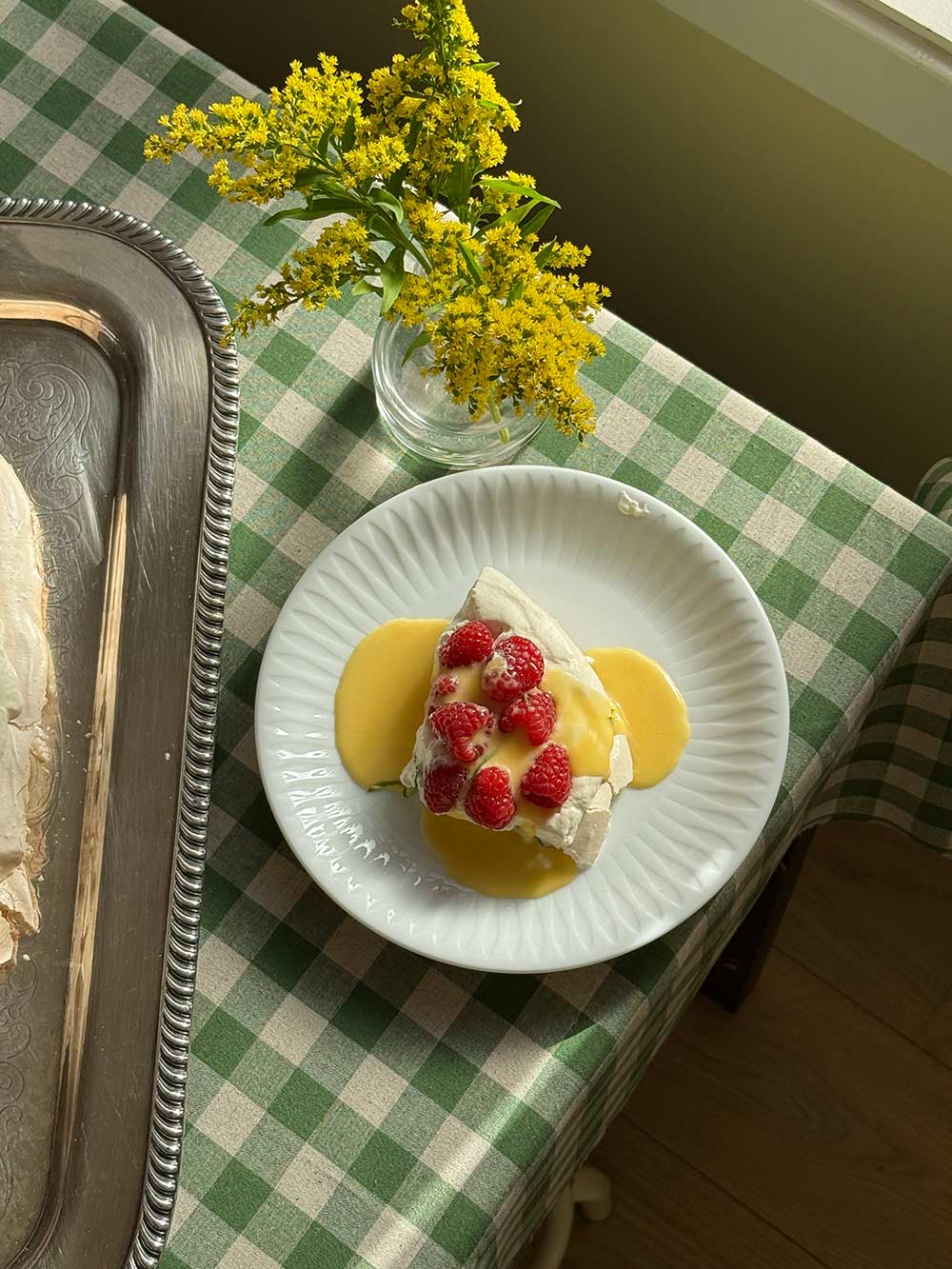 Sommerdessert fra @sultnegutter. Et luftig lag marengs, silkemyk krem, søte bringebær og en frisk sitronsaus – dette er sommerdesserten du vil servere igjen og igjen. Inspirert av sesongens bær og klassiske smaker, har @sultnegutter satt sammen den perfekte pavlovaen – servert på det tidløse serviset Spire fra Porsgrunds Porselænsfabrik.