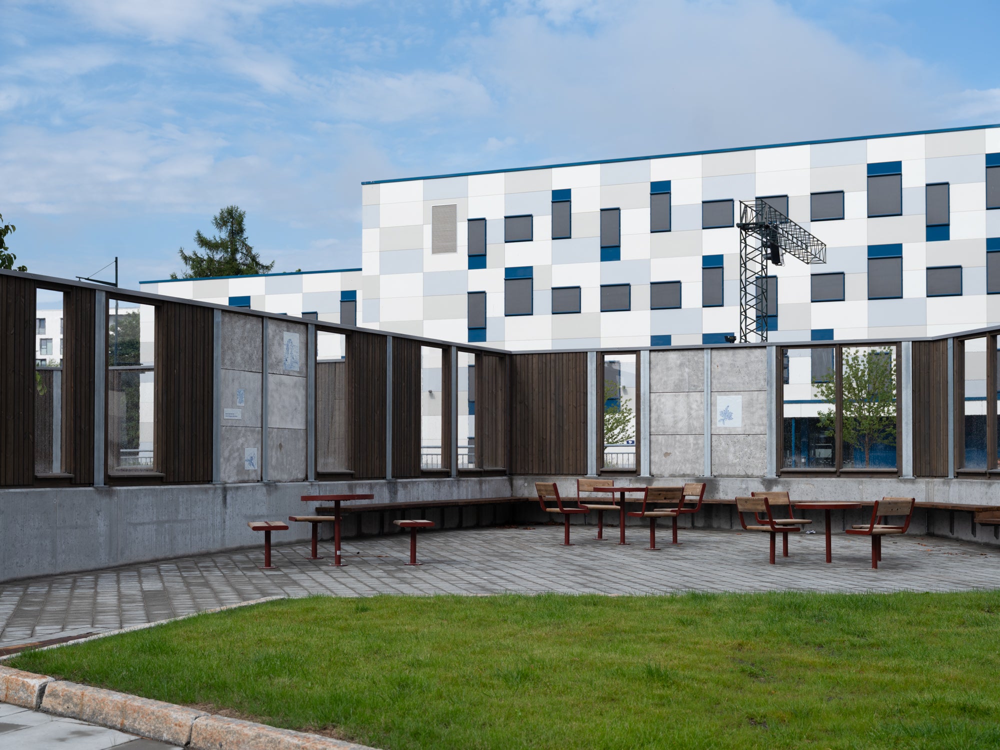 Kunstnerne Trygve Ohren og Charlotte Rostad står bak et omfattende kunstverk som består av flere felt med porselensfliser, integrert i støyskjermene på skolens uteområder. Et større parti – hele 176 håndlagede fliser – er felt inn i betongveggen ved sykkelparkeringen. Under produksjonen har kunstnerne arbeidet både ved Porsgrunds Porselænsfabrik og ved Kunsthall Grenland, og verket bærer tydelige spor av dette samarbeidet. Rester fra porselensfabrikken er gjenbrukt i flere av flisene, som også er brent på fabrikken, og kunstnerne har i tillegg tatt i bruk betongstein fra fasaden i Nordre gate 12 i Trondheim.