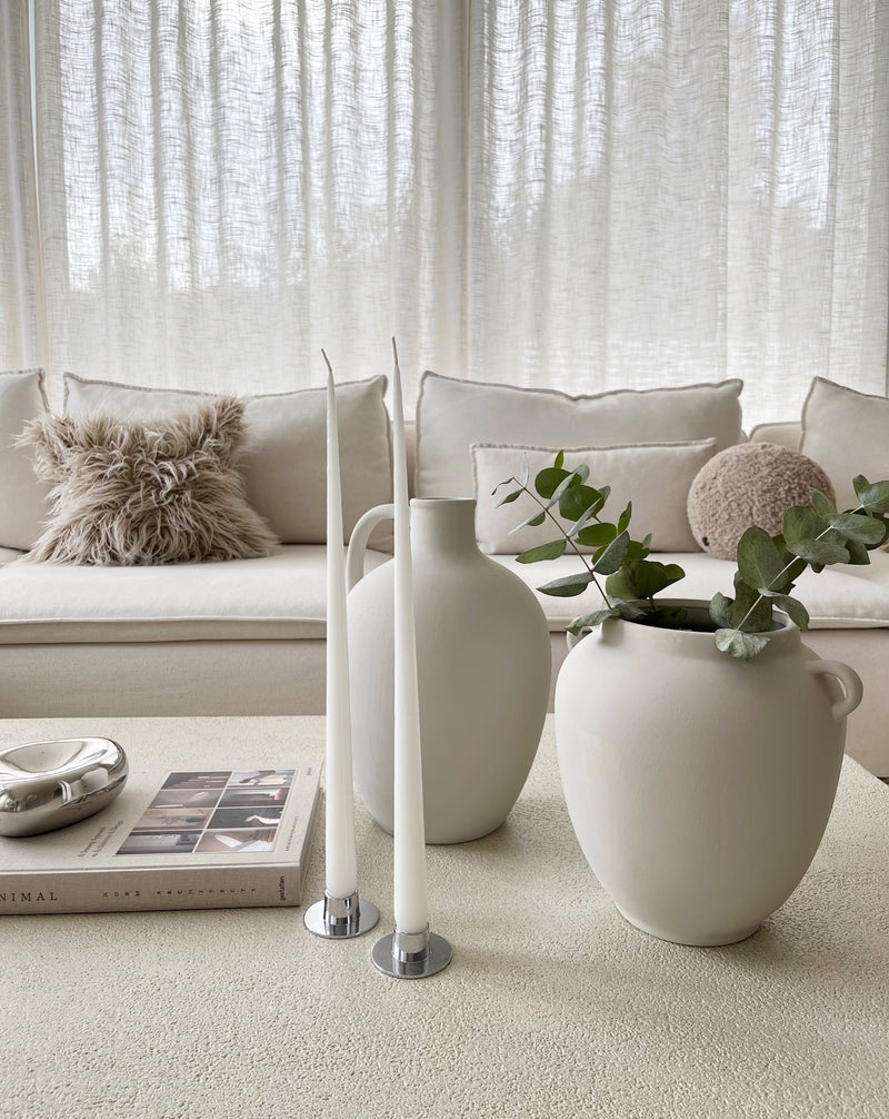 The Cleo vase, standing at 26 cm, features an elegant shape and a soft, light beige color with a beautifully polished surface. It’s perfect for adding a refined touch to your home, whether displayed alone or filled with flowers, twigs, or dried grasses. Ideal for the coffee table, a shelf, or a windowsill.