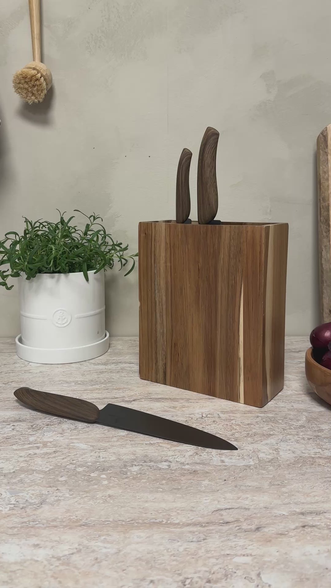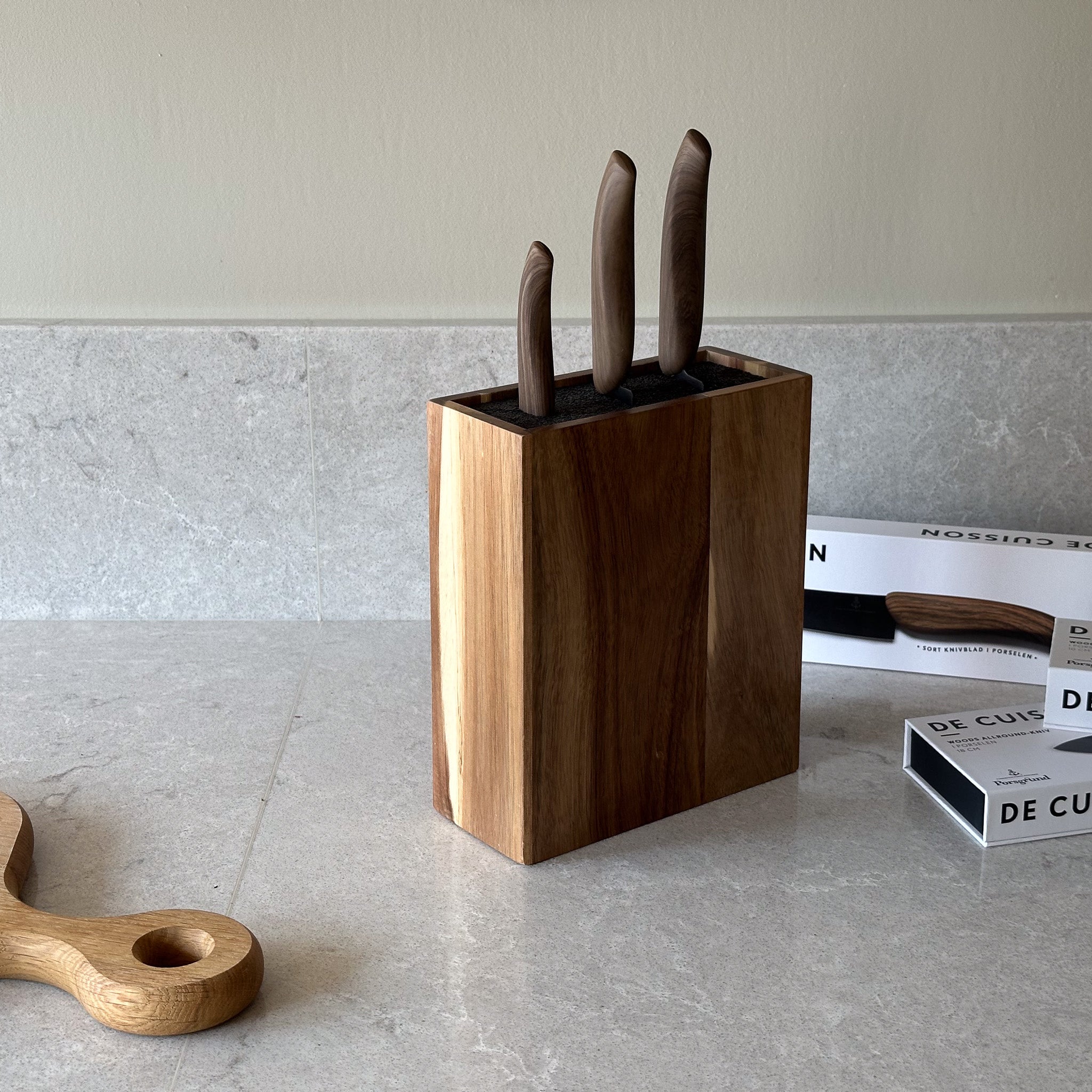 Knivblokken har et klassisk og enkelt design. Passer inn i alle type kjøkken. Knivblokken er laget i bærekraftig Acasiatre. Kniver står stødig og kan settes i flere posisjoner i plaststråene. Stråinnlegget kan tas ut for rengjøring. Knivblokken rengjøres med en fuktig klut.