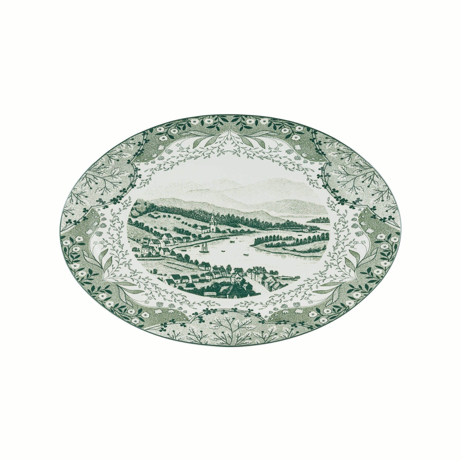 Et elegant serveringsfat i grønn Vintage, perfekt til kaker, pålegg eller mindre serveringer. Det ovale formatet fremhever landskapsmotivet og gjør fatet til et dekorativt element på bordet.