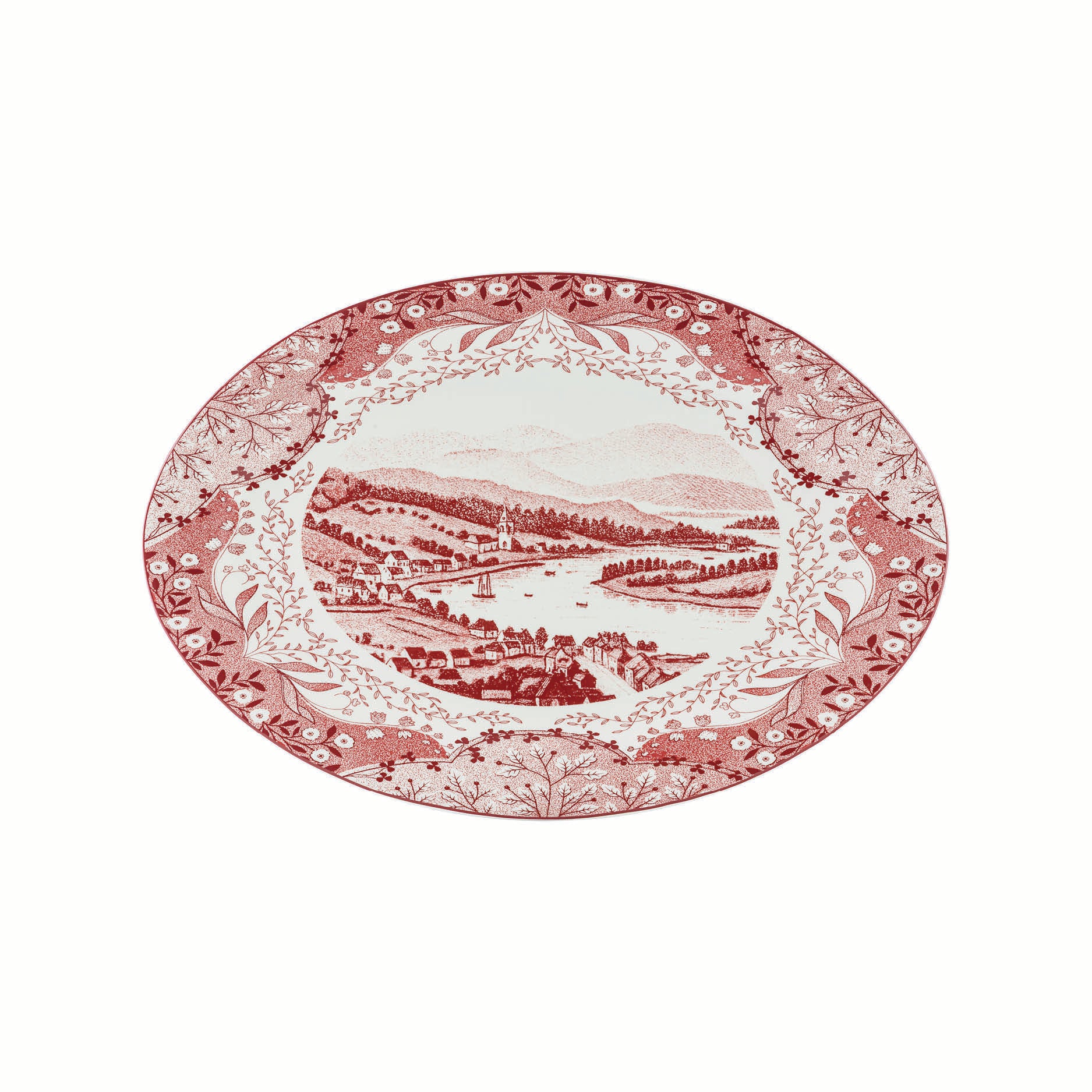 Et elegant serveringsfat i rød Vintage, ideelt til kaker, pålegg eller mindre anretninger. Det ovale formatet fremhever landskapsmotivet og gjør fatet til et dekorativt midtpunkt på bordet.