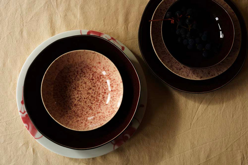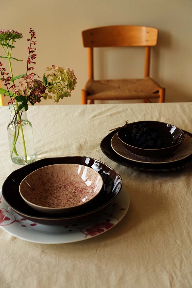 En liten, dyp tallerken i lekre lyngtoner – ideell til frokost, suppe eller småretter. Den dus-mønstret glasuren gir et delikat og håndlaget uttrykk.