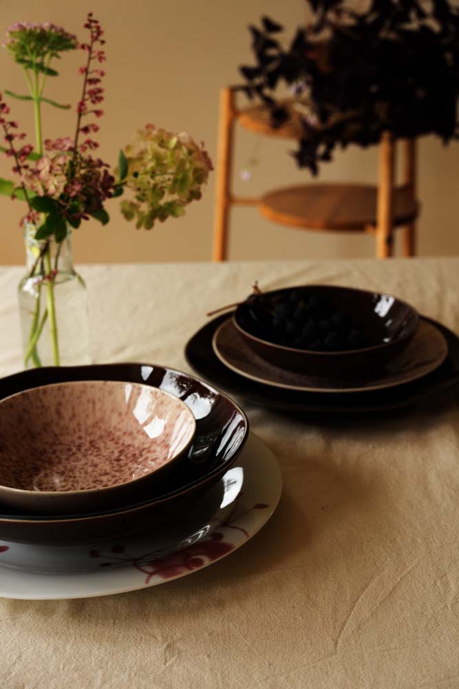En romslig dyp tallerken i rik burgunder, perfekt til pastaretter, gryter og salater. Den skaper en elegant kontrast på bordet og passer både til hverdags og fest.