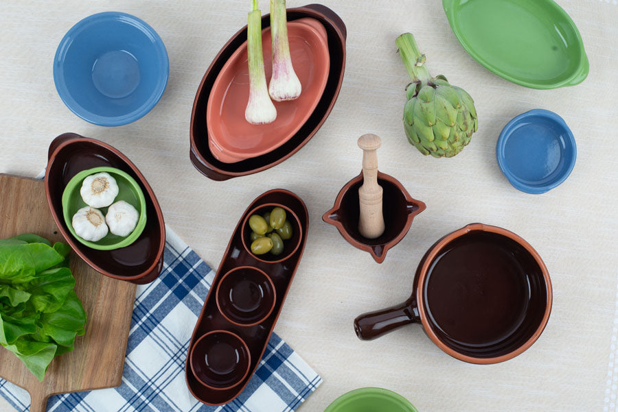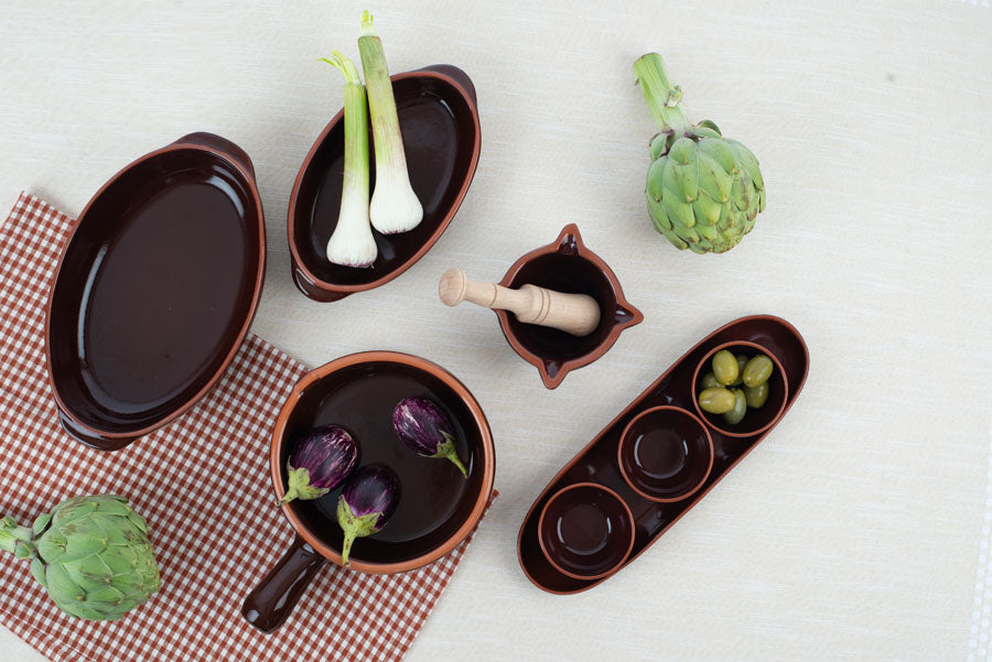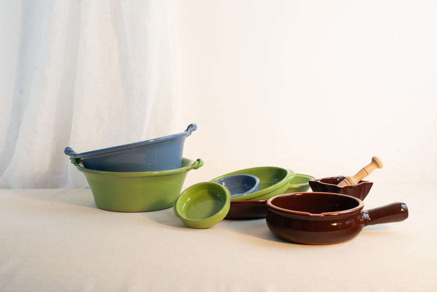 Terracotta is porous but withstands both cold and high heat. The products are oven-safe up to 260 degrees and can be used in a microwave, dishwasher, and freezer. To ensure durability, an initial treatment is recommended before use.