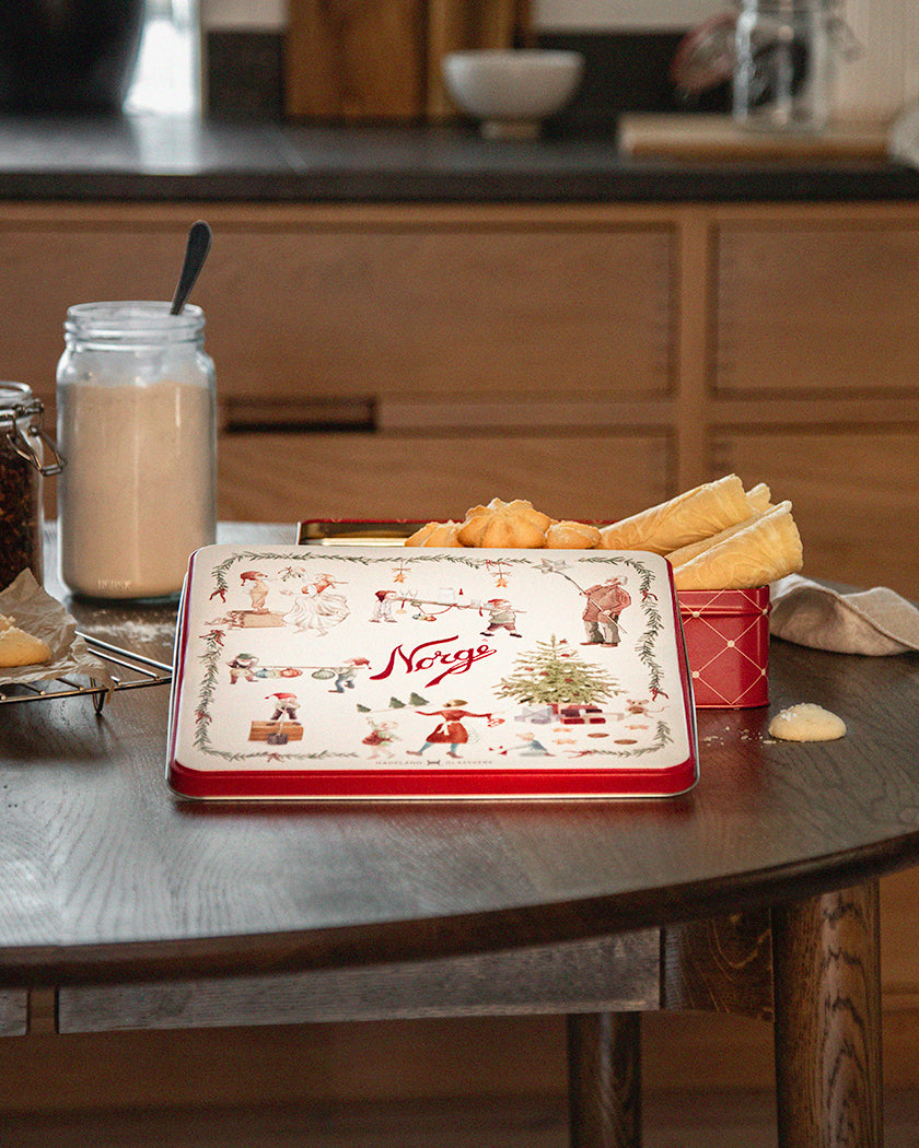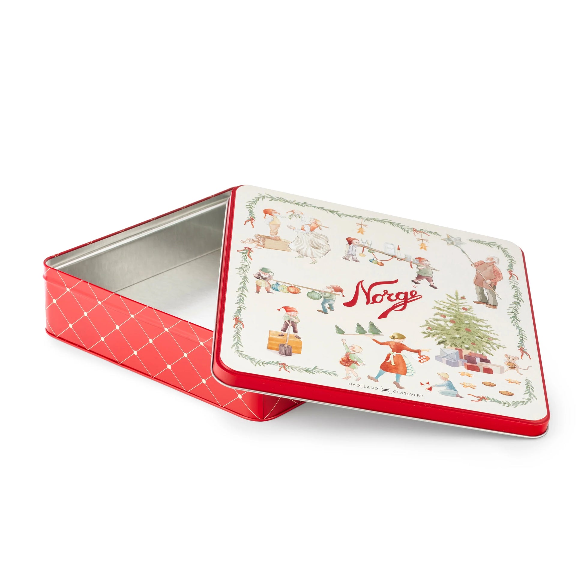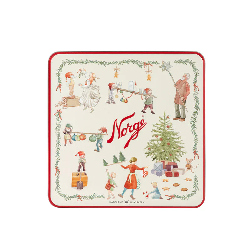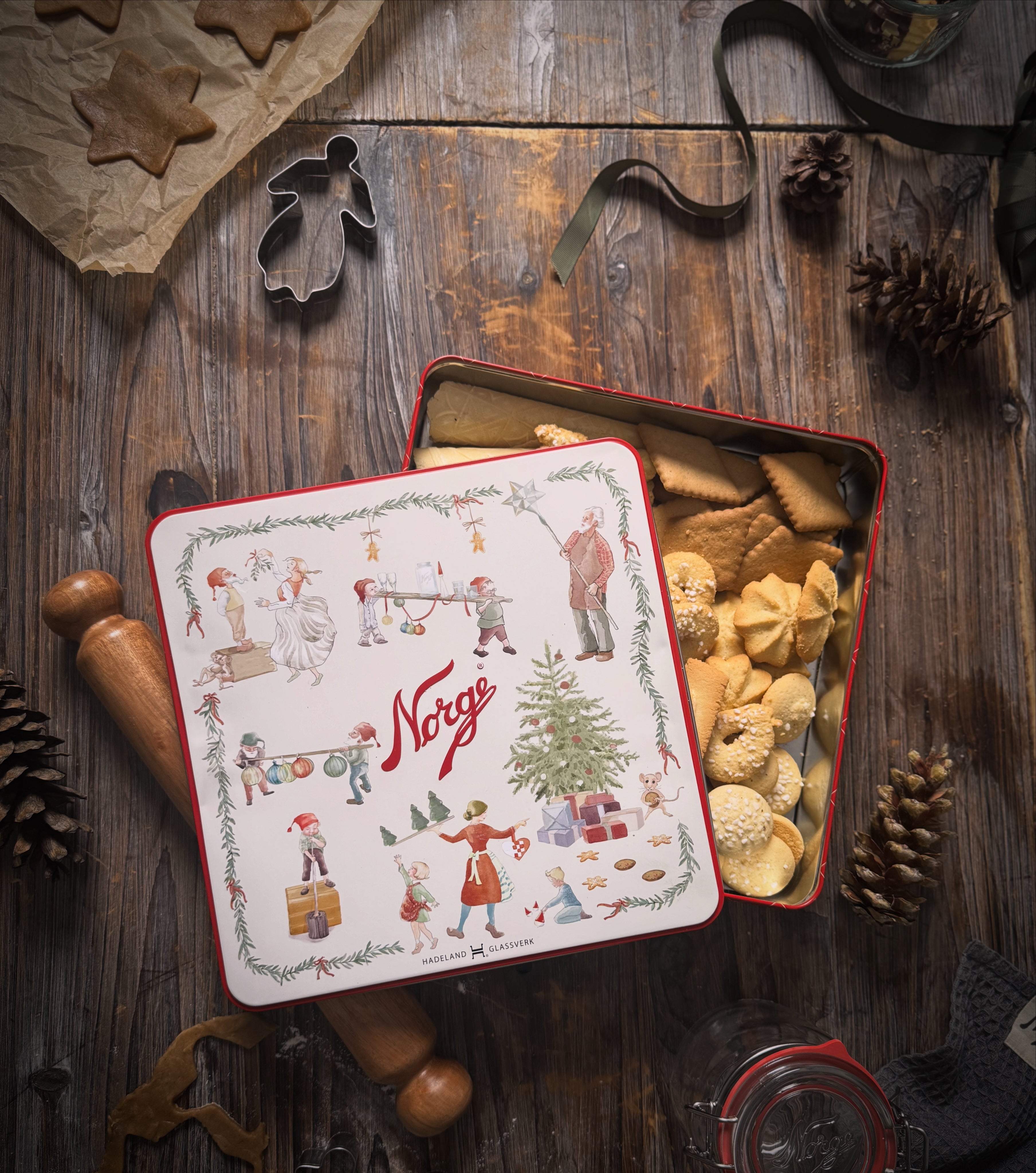 Motivet er skapt av designer Lisbeth Lutnæs, inspirert av nissens juleverksted og de travle dagene i Glasshytta på Hadeland, der Norgesglass en gang ble til. En sjarmerende boks som sprer ekte julestemning – også lenge etter at kakene er spist opp.