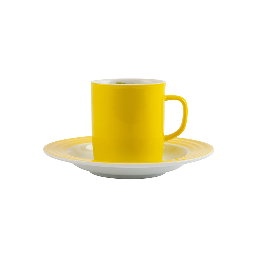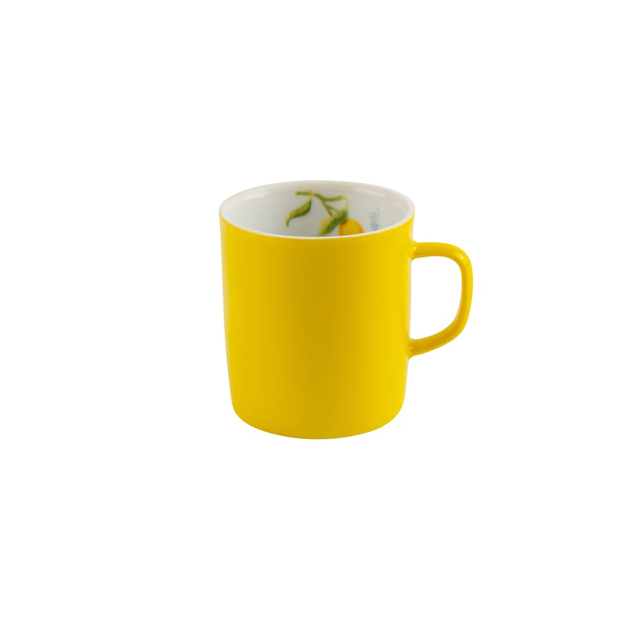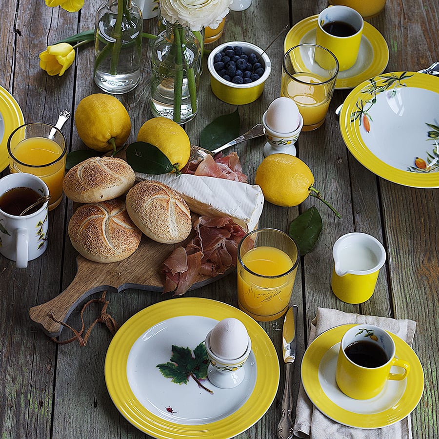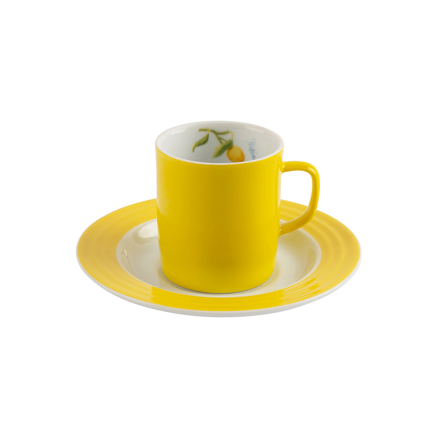 The perfect cup for a small espresso or a strong coffee. The cup has a yellow exterior and a lemon branch with fruit on the inside, while the saucer features a combination of yellow and white. This smaller version compared to the 23 cl cup is ideal for a short coffee break. Pair it with the egg cups for a complete breakfast setting or with the larger 23 cl cup & saucer for a versatile coffee service.