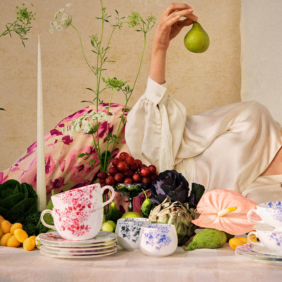 The Porsgrunds Porselænsfabrik x byTiMo collaboration is a tribute to timeless beauty and tradition. The collection consists of nine pieces, each uniquely designed with inspiration from Japanese and European shapes, combined with motifs from Tine Mollatt's extensive archive. You can use the pieces individually or mix and match the different colors to create your own personalized table setting. Every piece tells its own story, with the gold details adding a luxurious and artisanal touch.