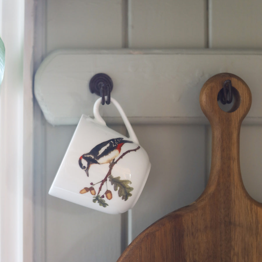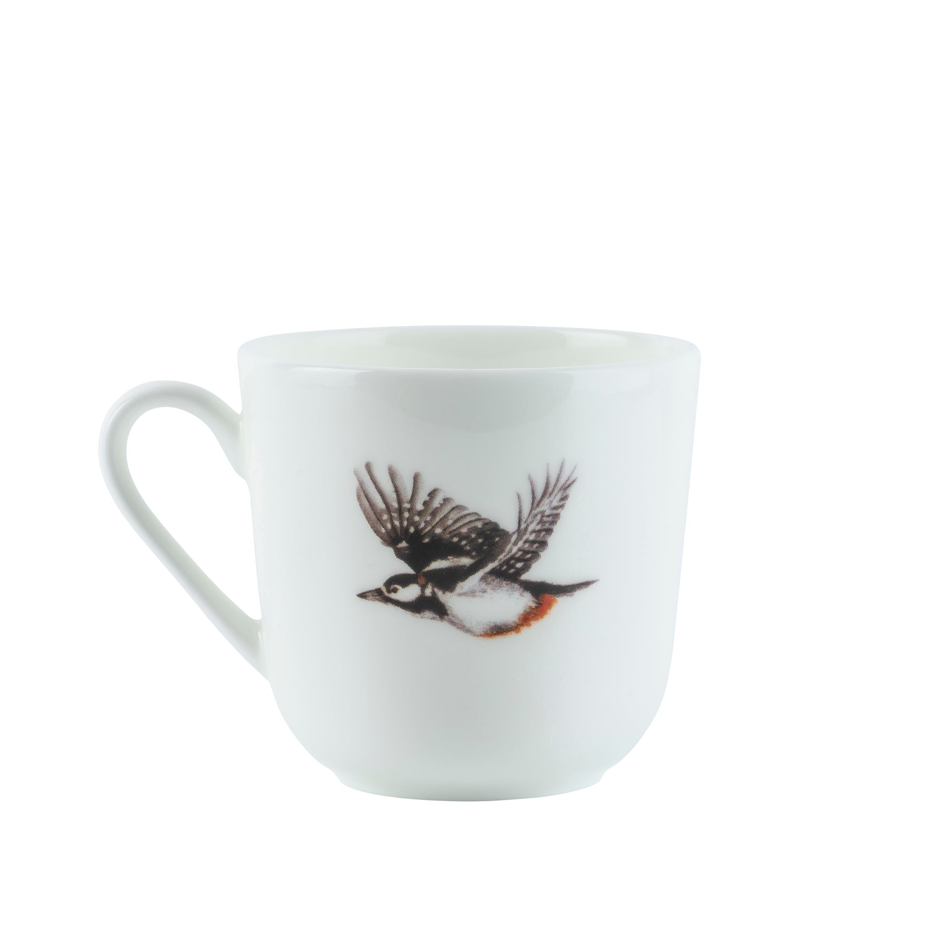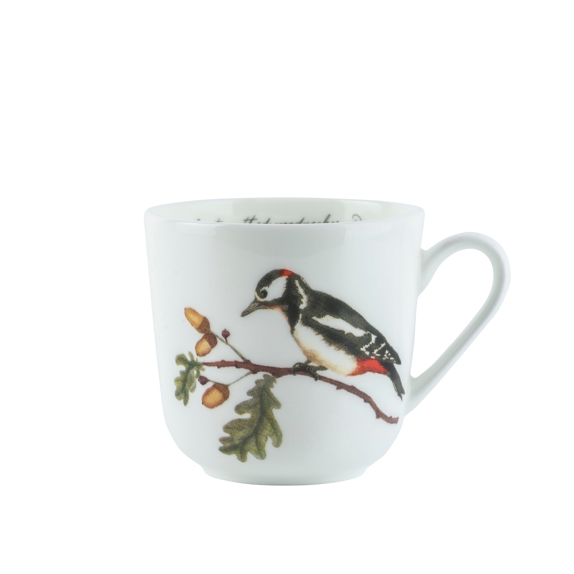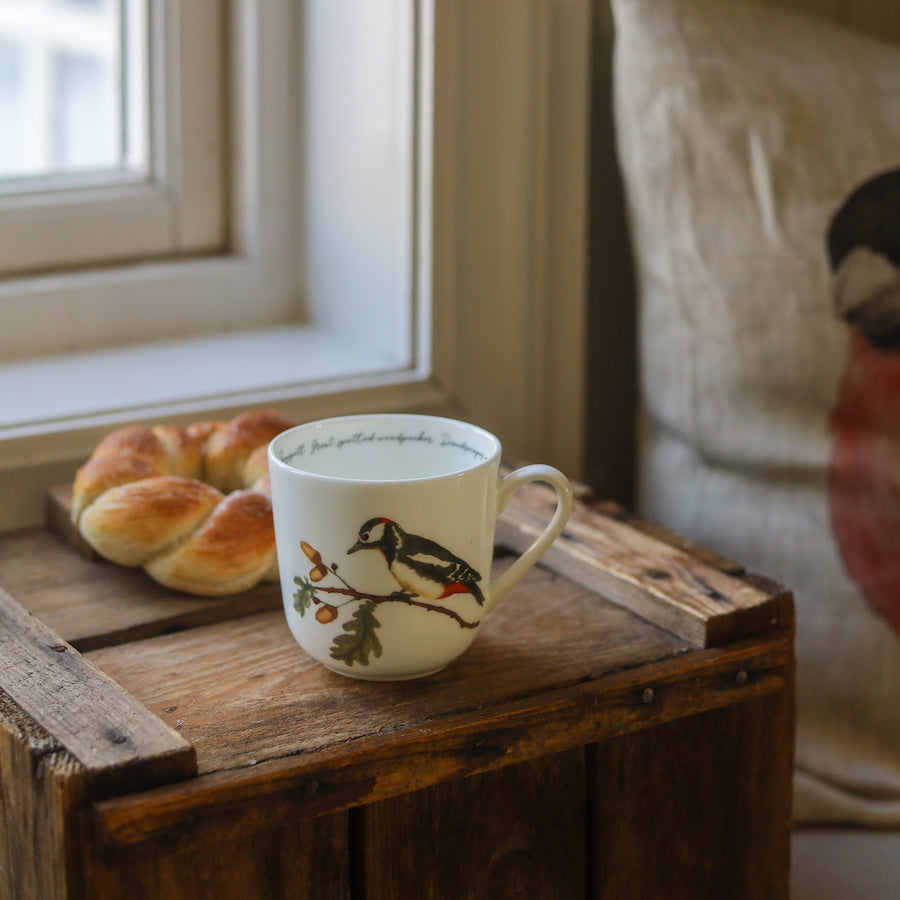 Elegante krus i gjennomskinnelig benporselen. Disse krusene rommer 30 cl og er tynne og gode å drikke av. Motivene er basert på akvareller malt av Cathrine Kirkerud, og vi har valgt noen av de vanligste fuglene å finne på fuglebrettet, her ser du Flaggspetten. Inni kruset står navnet på fuglen både på norsk, latinsk og engelsk.