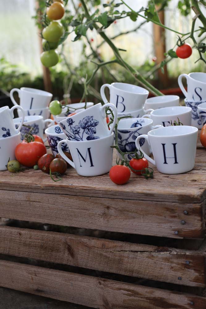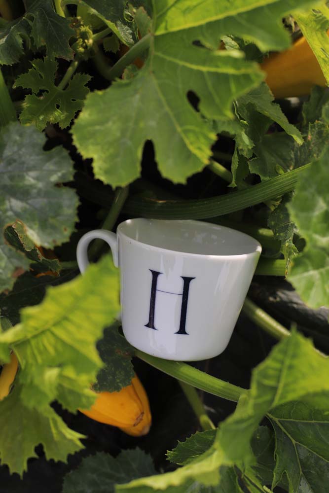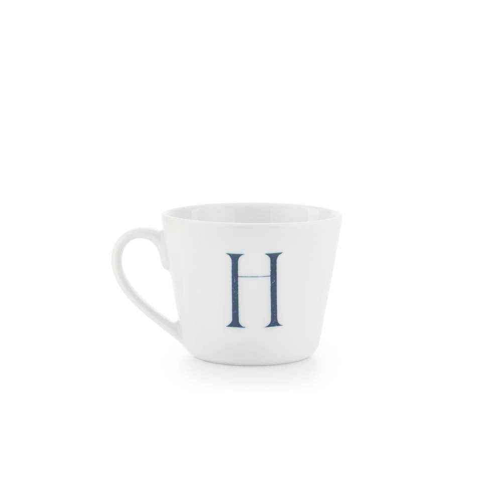 Bokstavkrus H er dekorert med hylleblomst, en plante med lette, florlette former. Illustrasjonen gir kruset et poetisk og sommerlig uttrykk. Perfekt som en gjennomtenkt gave, med oppfordring til rolige kaffestunder.