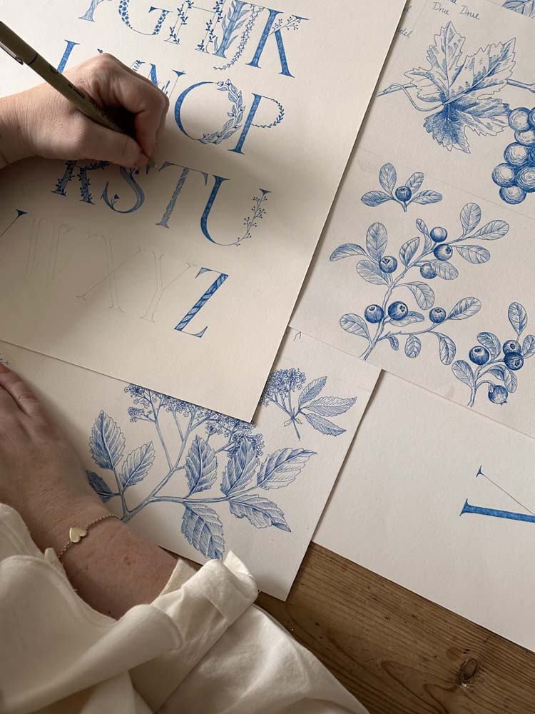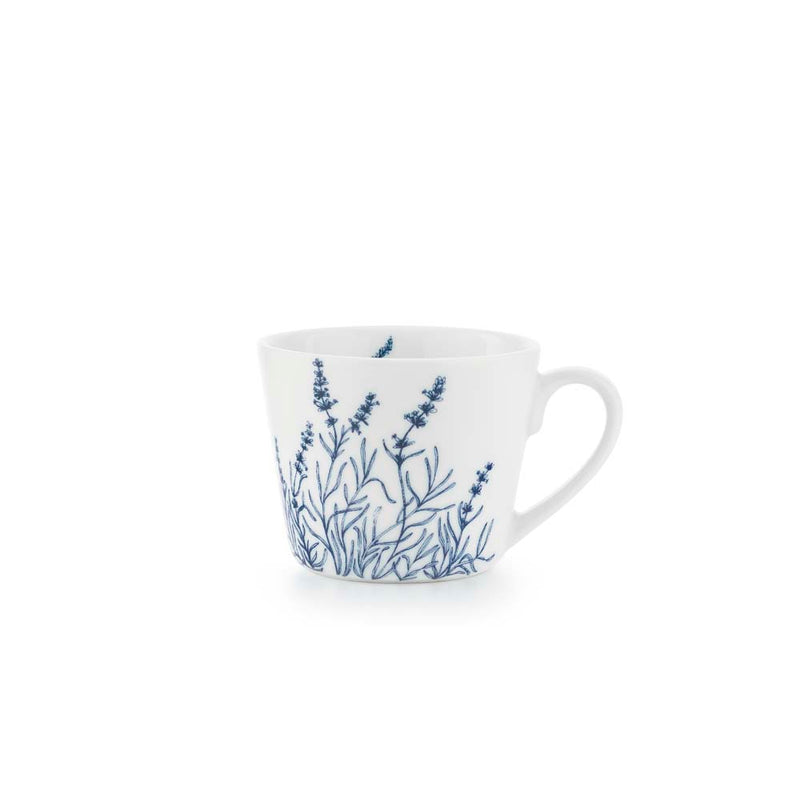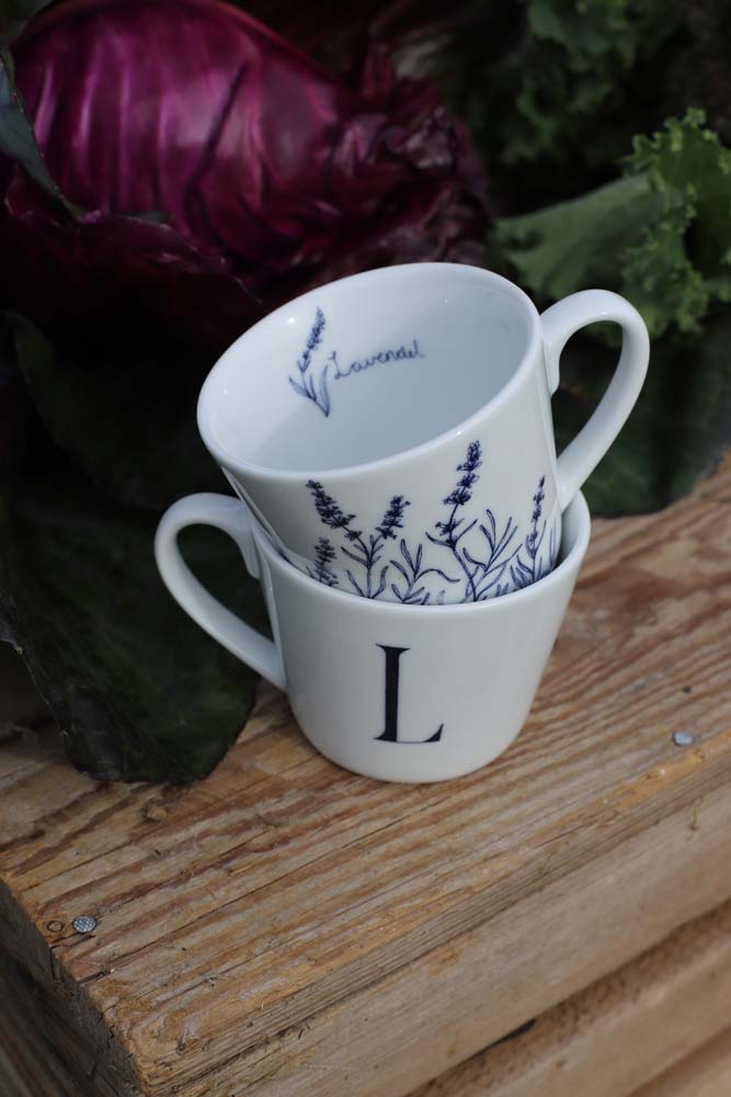 Bokstavkrus L er dekorert med lavendel, kjent for sin ro og sitt elegante uttrykk. Illustrasjonen gir kruset et harmonisk og balansert preg – et krus som inviterer til rolige øyeblikk og varme drikker.
