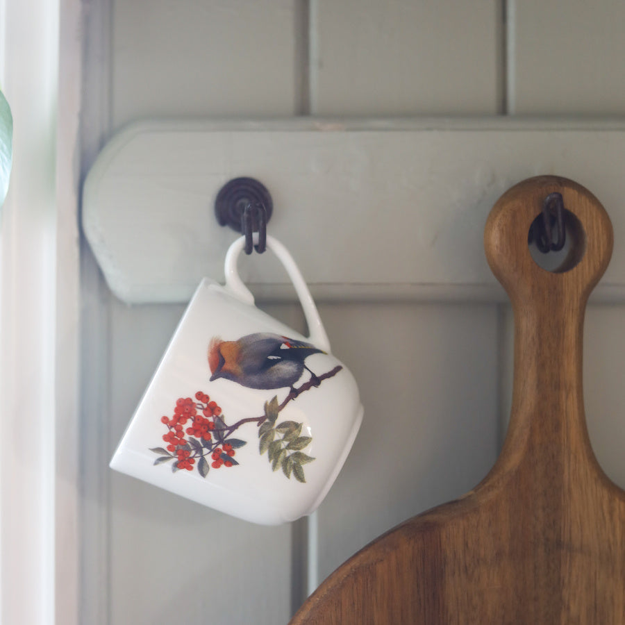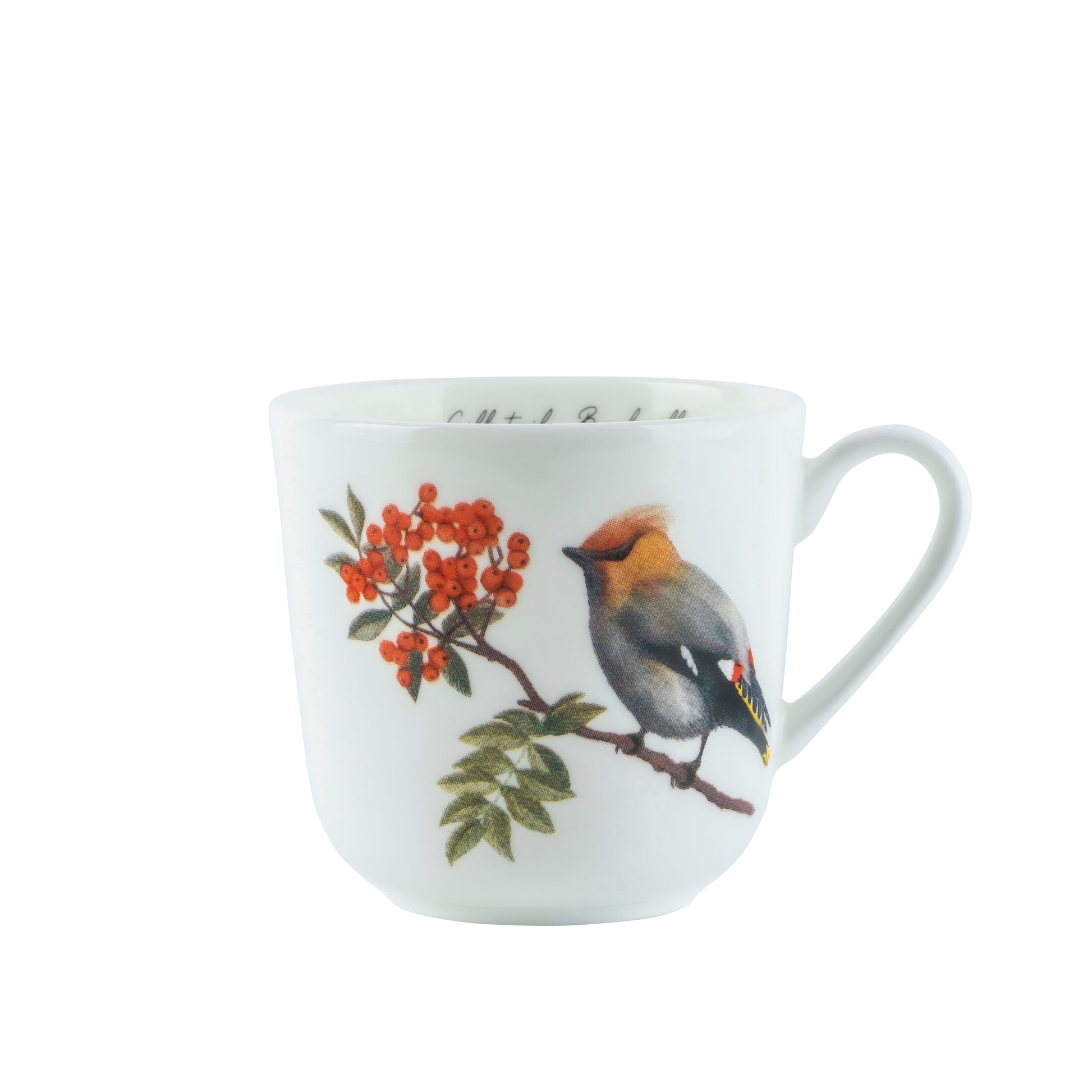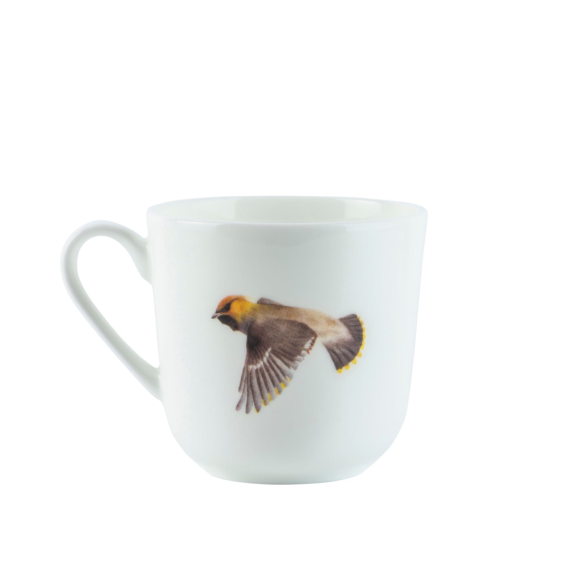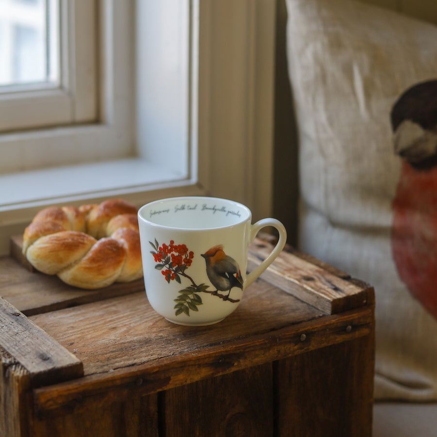 Elegante krus i gjennomskinnelig benporselen. Disse krusene rommer 30 cl og er tynne og gode å drikke av. Motivene er basert på akvareller malt av Cathrine Kirkerud, og vi har valgt noen av de vanligste fuglene å finne på fuglebrettet, her presentert med Sidensvans. Inni kruset står navnet på fuglen både på norsk, latinsk og engelsk. Det er dekor av fuglen på begge sidene av kruset, både på en gren og ute mens den flyr.