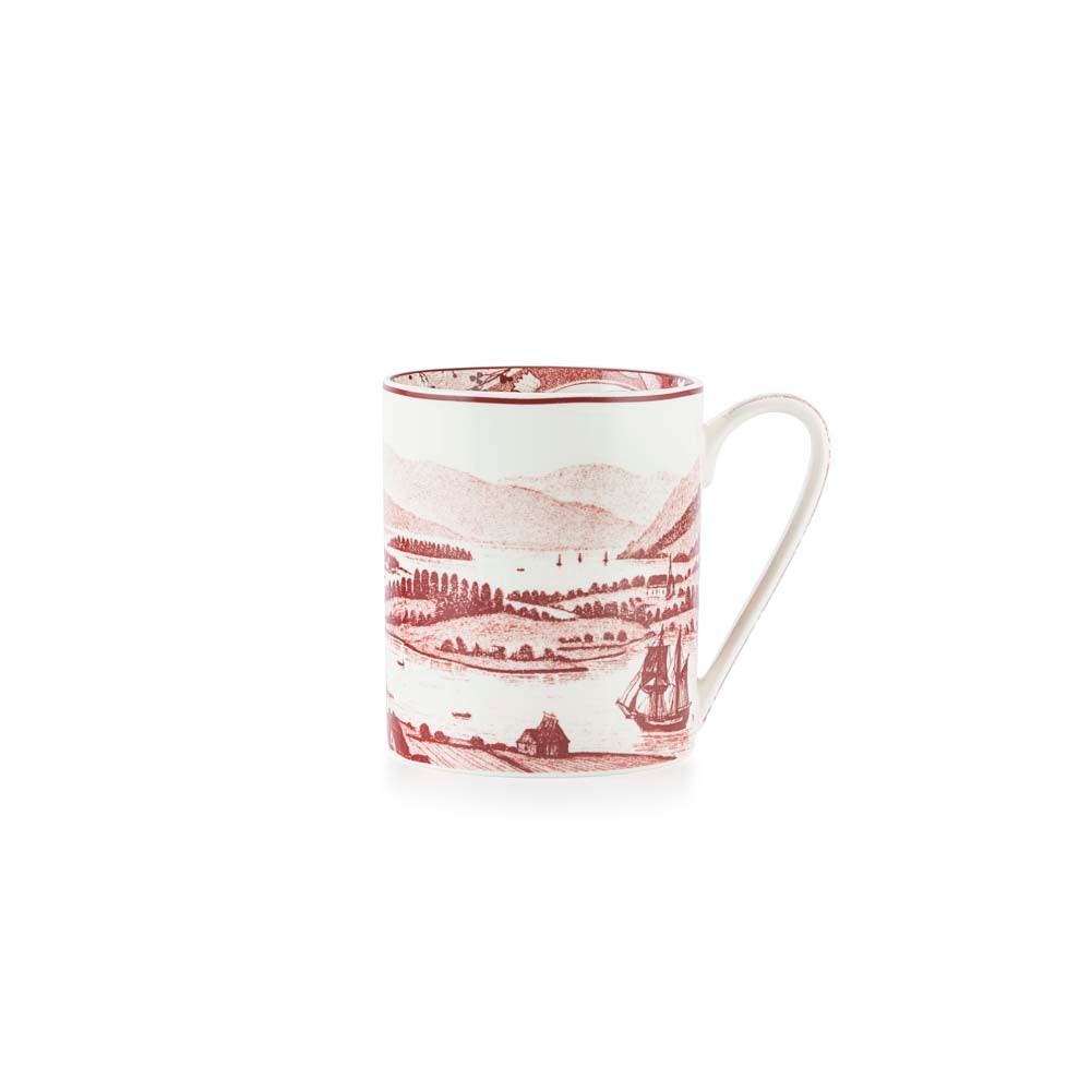 Krus i rød Vintage med landskapsmotiv inspirert av John-William Edys tidlige 1800-tallsmaleri av Porsgrunn. Den generøse størrelsen og komfortable hanken gjør kruset perfekt til kaffe, te eller kakao.