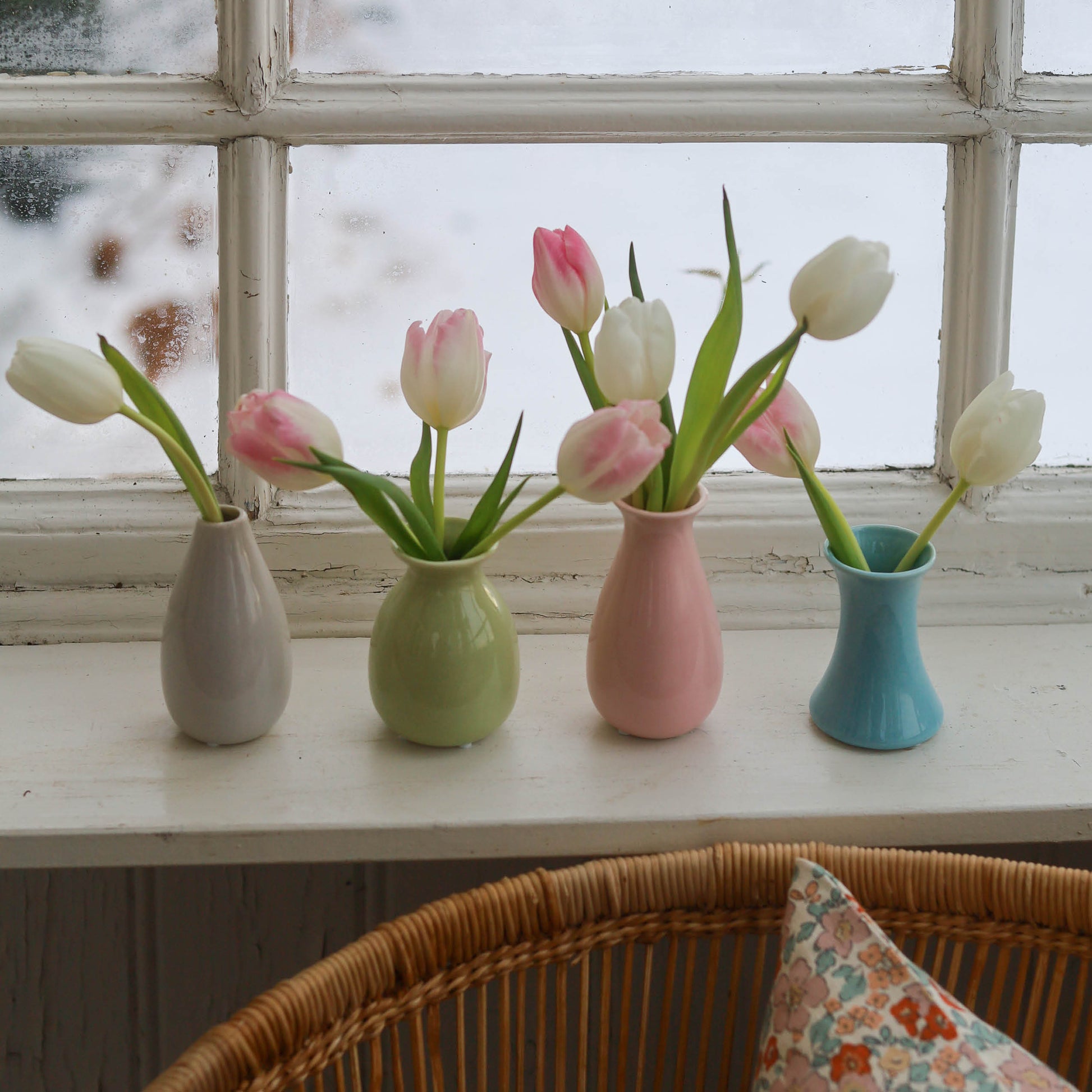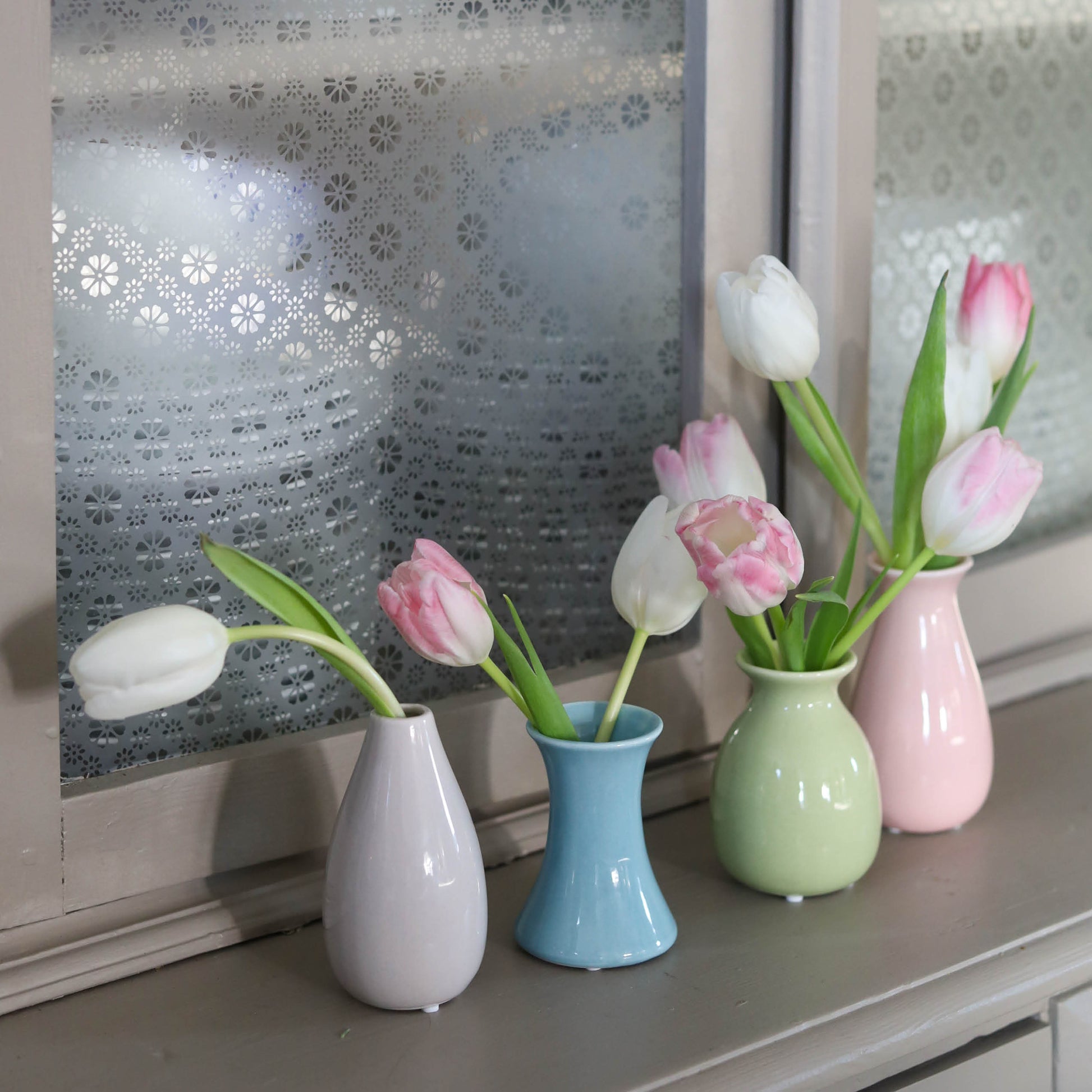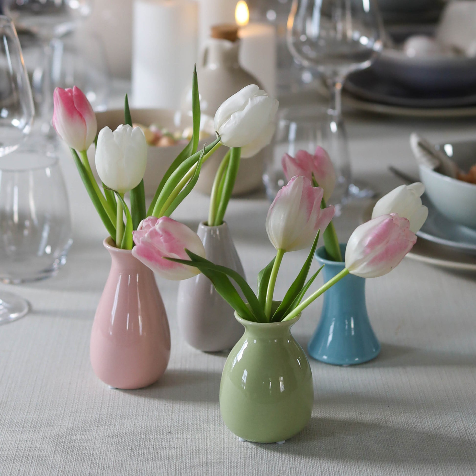 A set of 4 small vases in a beautiful design, perfect for simple floral arrangements or as decor on their own. With soft pastel colors – pink, green, gray, and blue – they brighten up any space and create a lovely spring atmosphere. These vases are great for spring and Easter, but also fit beautifully year-round as a cozy and stylish touch in your home.