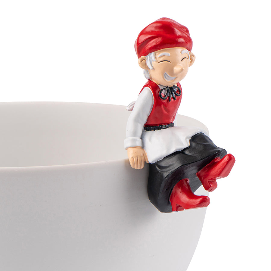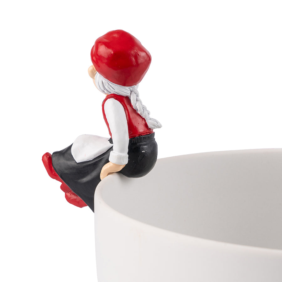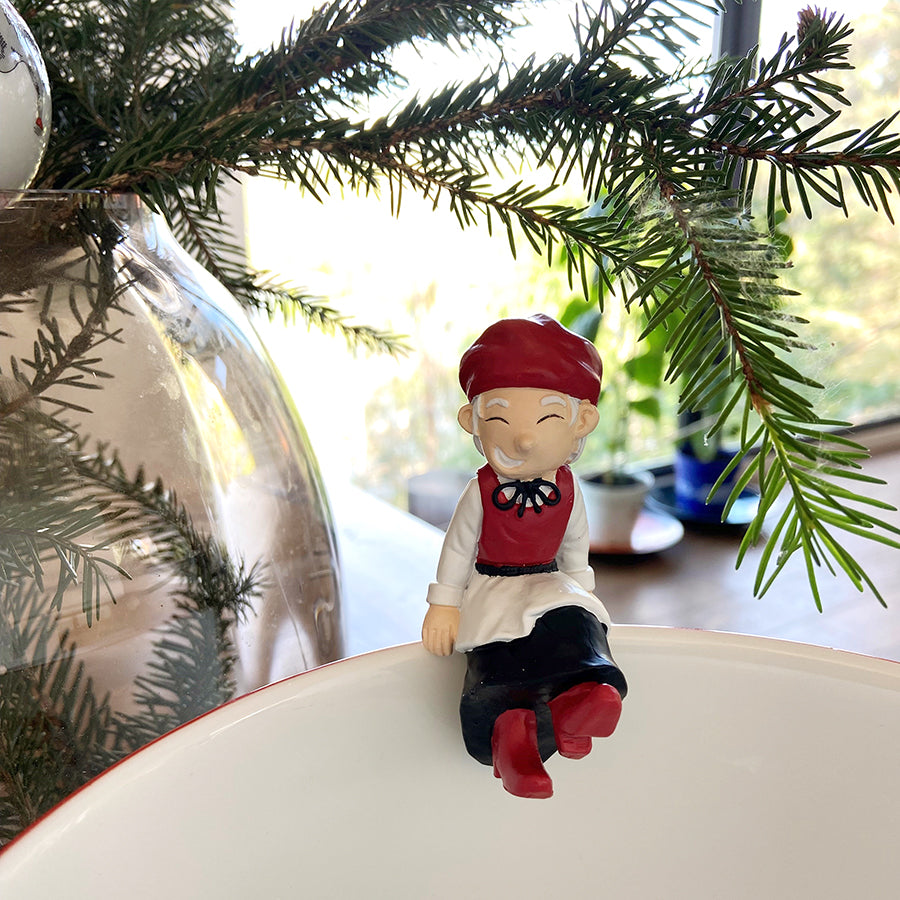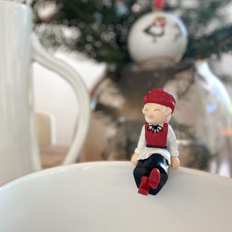 The Nisse wife dangling her legs is a charming little figure that sits on the edge of your plate. Dressed in cute clothes and a white apron, with a big smile on her face, she adds a playful and cozy touch to your table setting. This little Nisse wife creates a relaxed and joyful atmosphere around the Christmas table, perfect for spreading Christmas cheer among your guests.