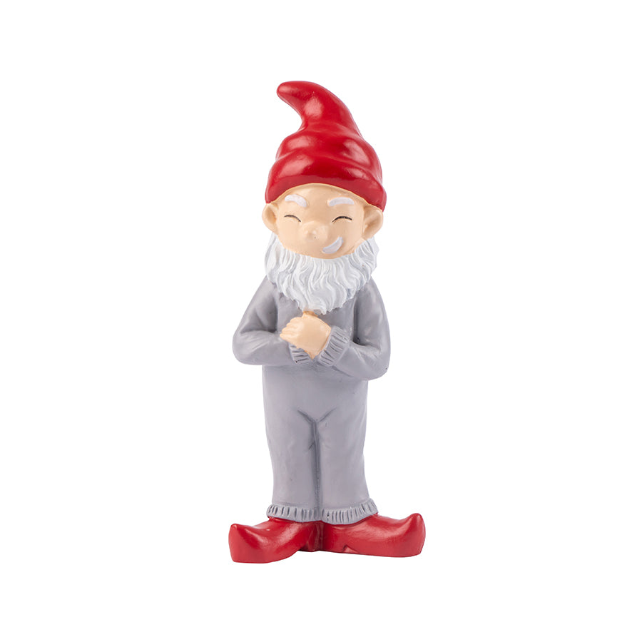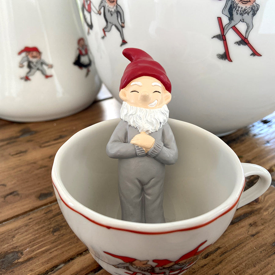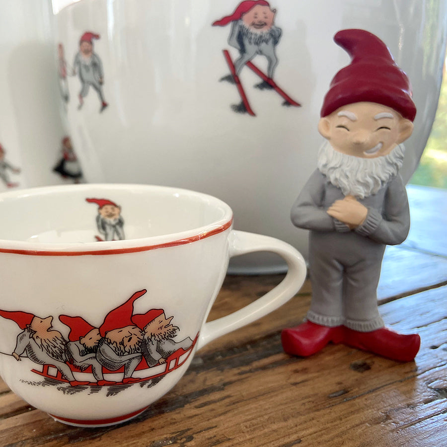 A small nisse figure dressed in a gray outfit, with a white beard and a red hat. He stands with his arms crossed, looking like he’s planning something mischievous. This nisse figure adds a playful and mysterious touch to your Christmas decorations and is perfect as a table ornament or as part of a display with other nisser from our collection. Bring the magic of Christmas to life with Porsgrund’s fun and playful nisser!