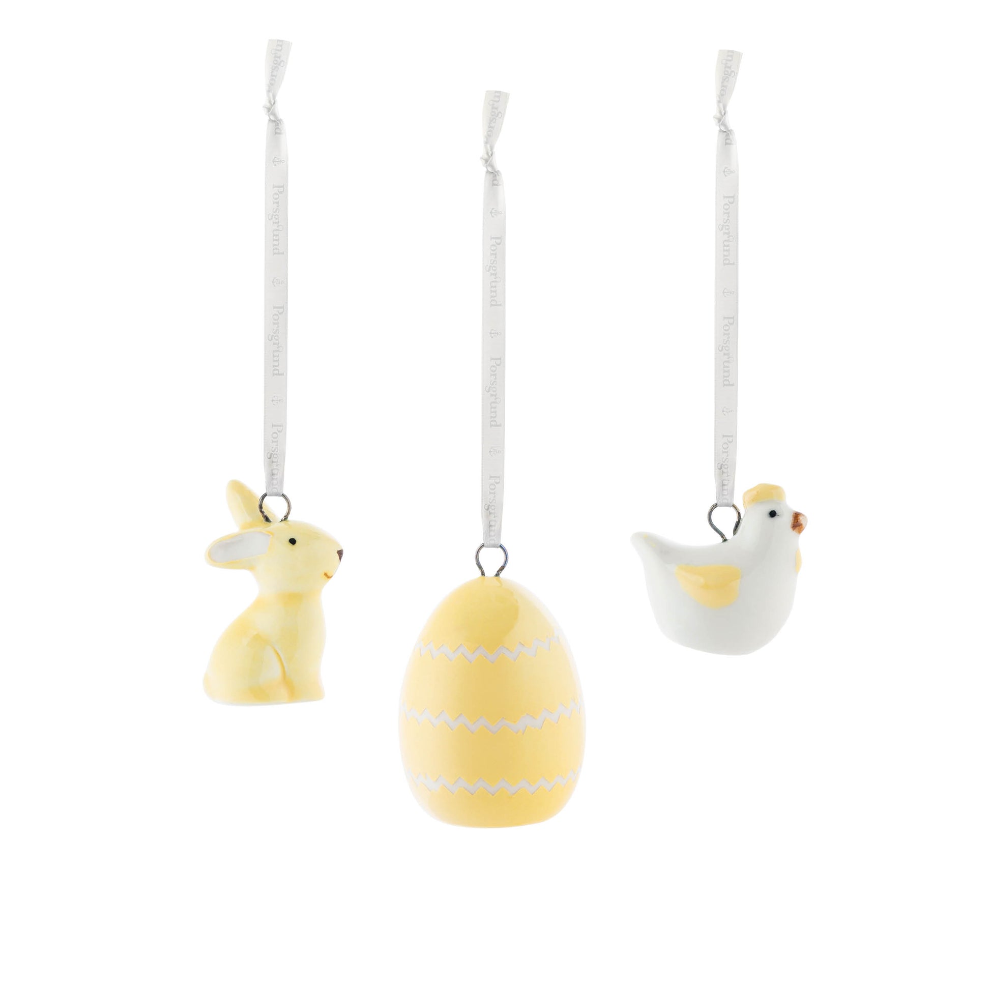 PÅSKEPYNT PORSELEN - HØNE, HARE, KANIN, EGG 3 PK - GUL