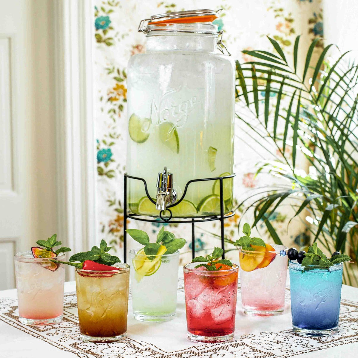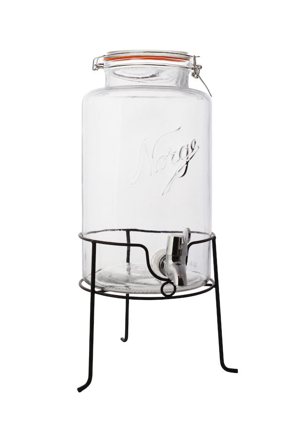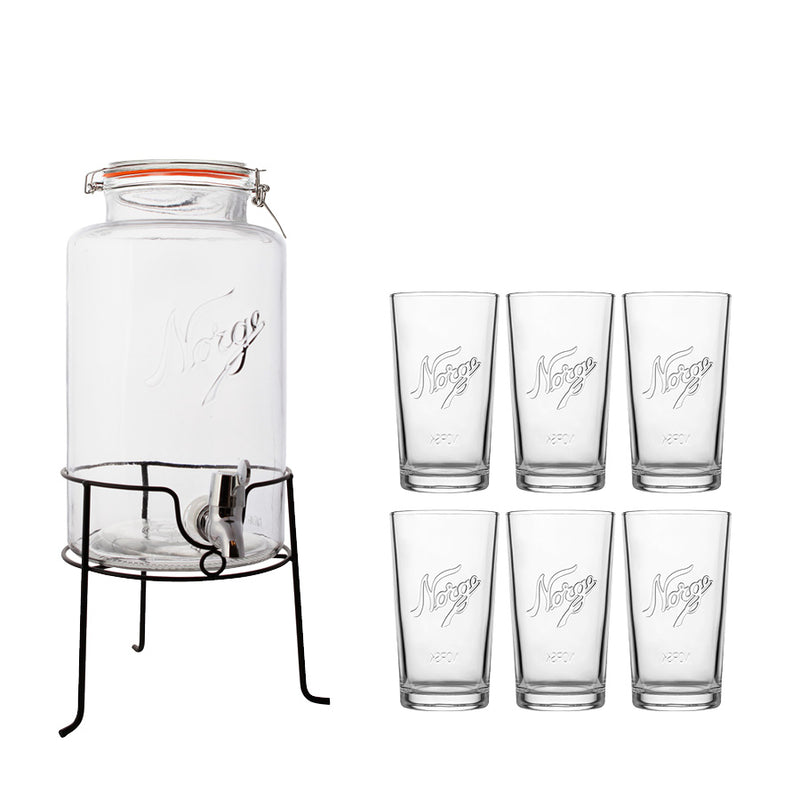 6 liters drikkedispenser med den tradisjonelle Norge-logoen. Fyll på drikke suppler med isbiter og tap ut iskald drikke! Perfekt til selskaper. I denne pakken følger det med praktisk og stødig stativ som gjør det lett å tappe drikke fra Norgesglass dispenseren, samt 6 stk kjøkkenglass i strørrelse 400 ml.