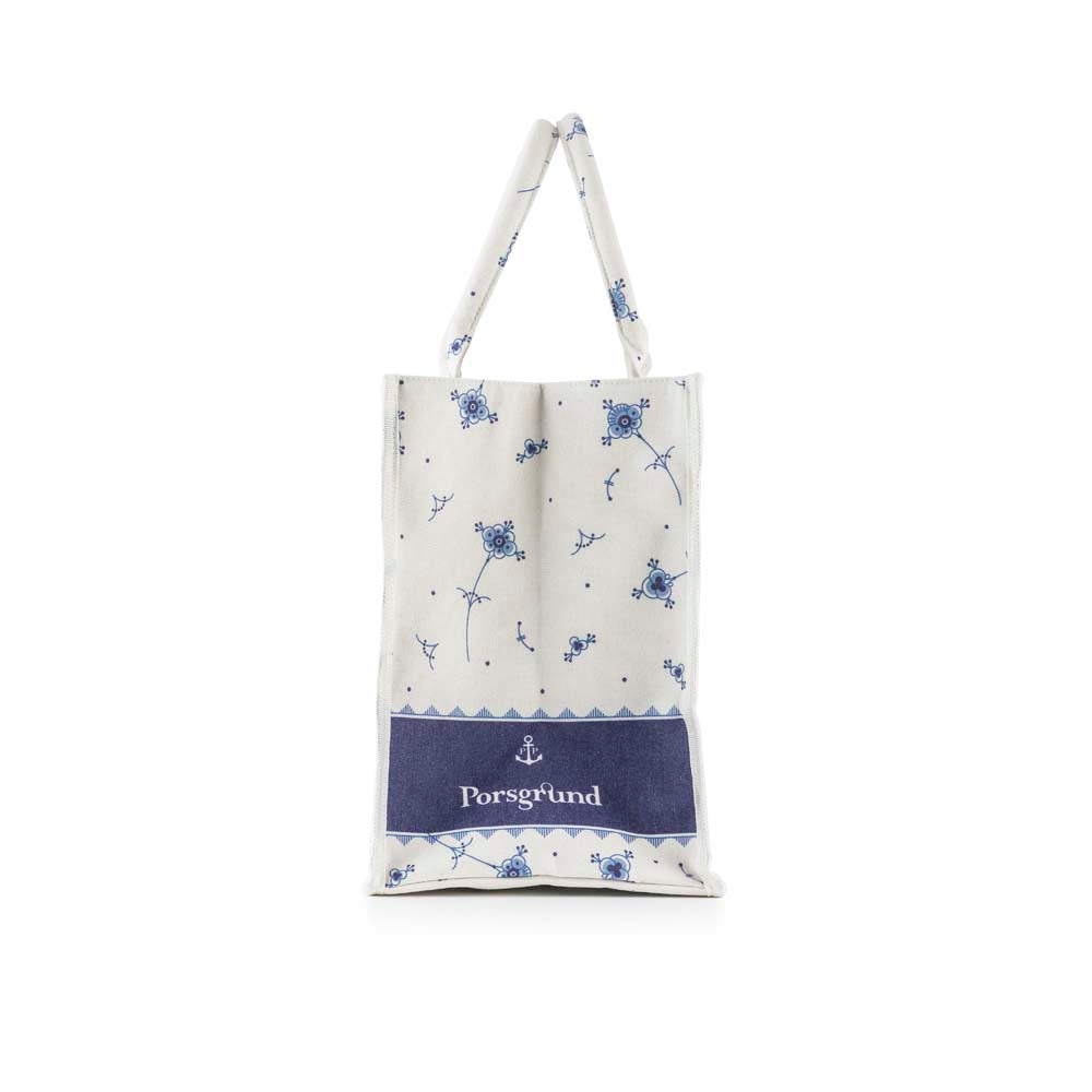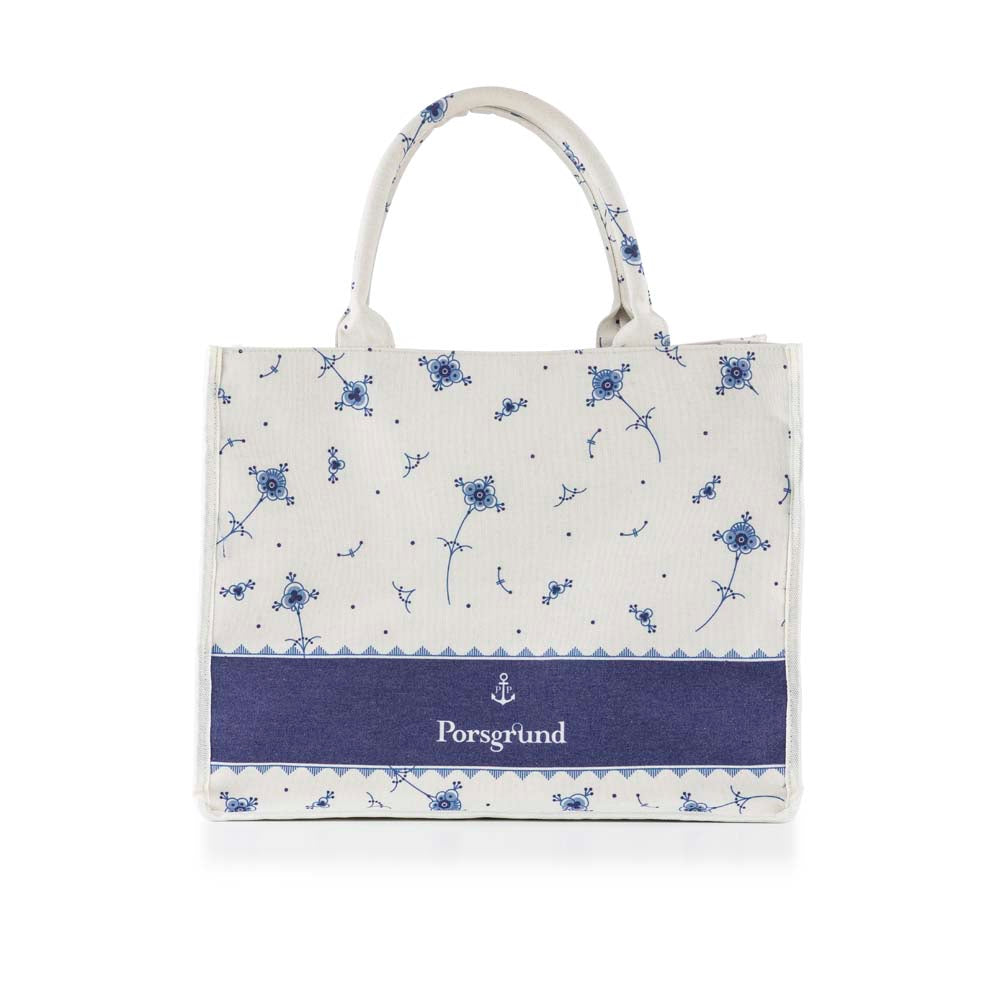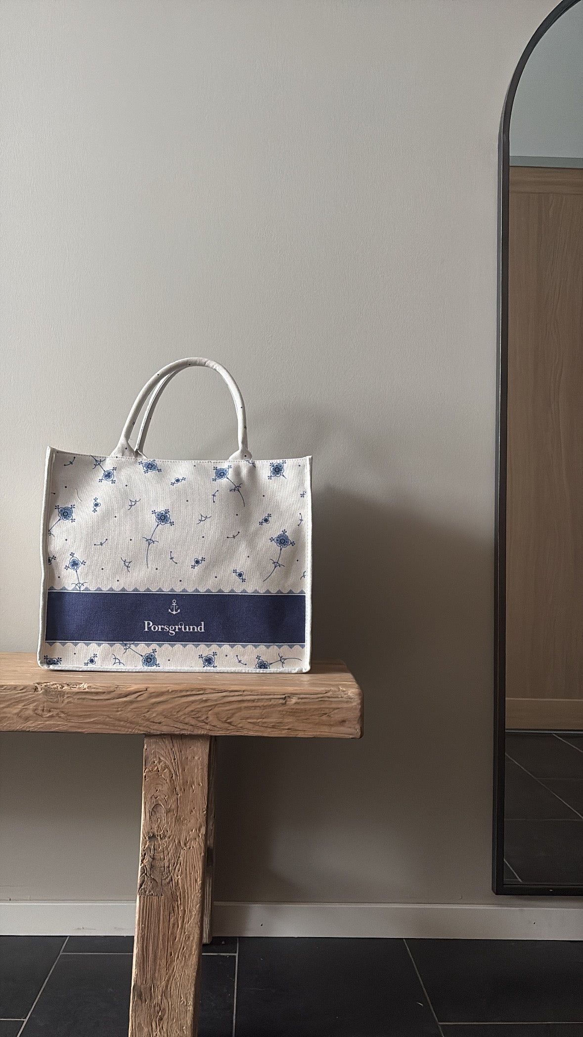 Denne romslige totebagen i 100 % bomullscanvas med vårt historiske og svært kjære blå stråmønster har blitt en stor favoritt!