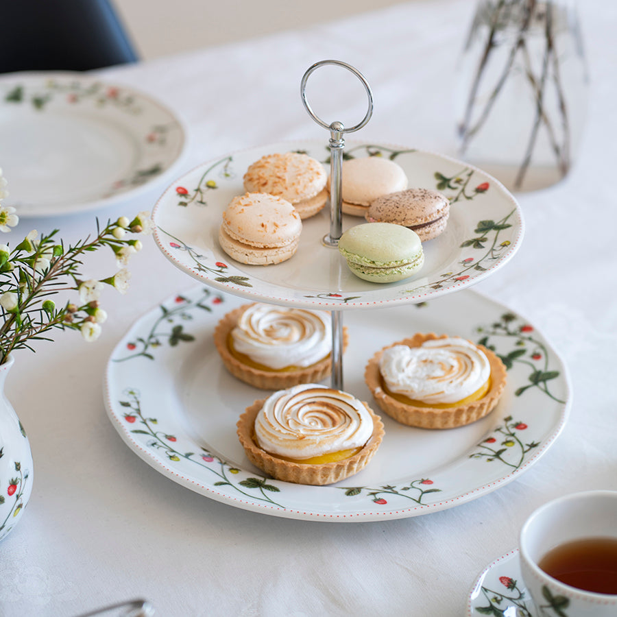 Dette elegante etasjefatet med fat på 21 cm og 27 cm er perfekt for å servere småkaker, bær eller andre sommerlige godsaker. Jordbæreng-serviset bringer frem minner om barndommens somre med duftende markjordbær og lange dager i solen. Med dette fatet kan du skape et nydelig serveringsbord til alt fra sommerfrokost på terrassen til kaffe og kaker i hagen. Forventet på lager onsdag 11 juni.