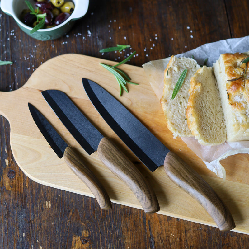 Woods-serien i De Cuisson-kolleksjonen fra Porsgrunds Porselænsfabrik kombinerer skarphet, kvalitet og design. Porselensbladene holder seg skarpe betydelig lenger enn stål, ruster ikke og påvirker ikke smaken på maten. Med sklisikre håndtak i gummi, designet for å etterligne tre, får du et stilrent og behagelig verktøy til kjøkkenet.