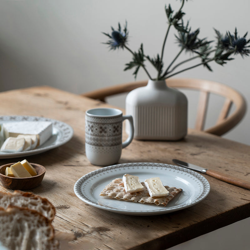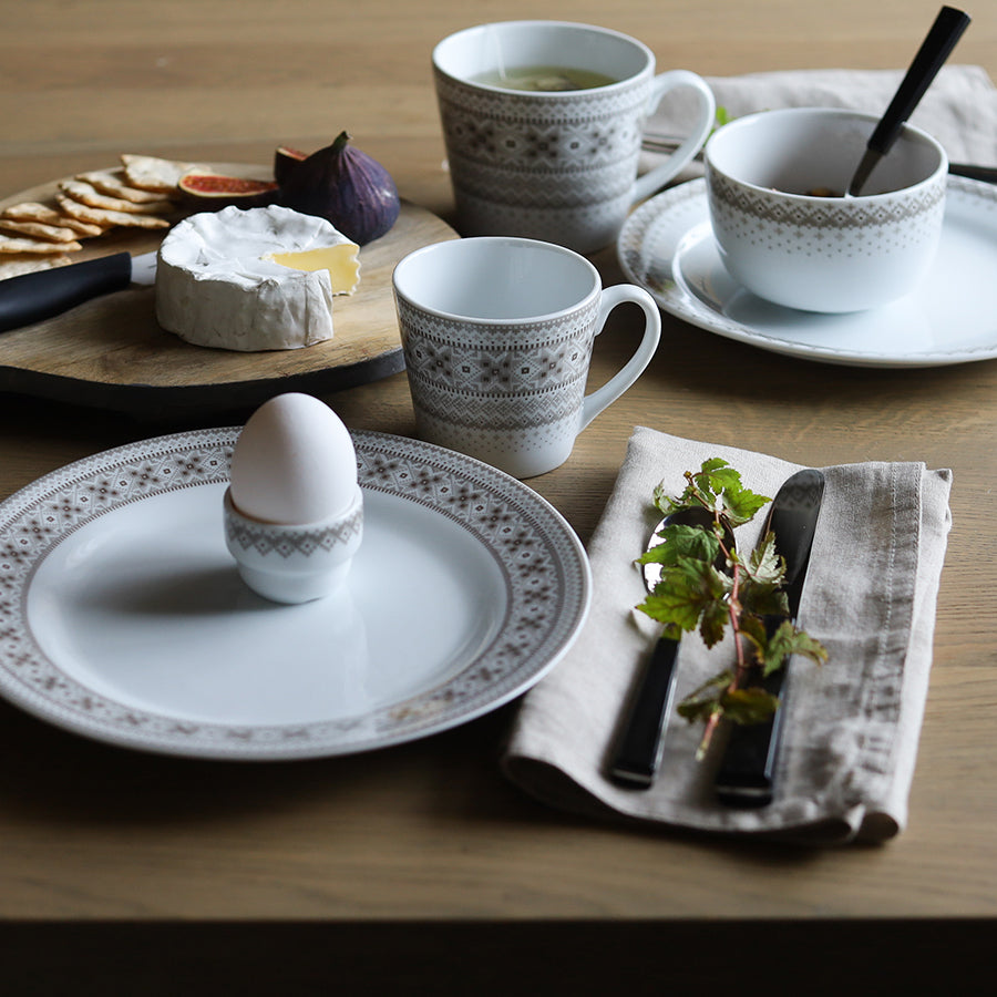 Da designer Cathrine Kirkerud utviklet dekoren til Ingrid-serviset, hentet hun inspirasjon lokalt. Med farger og mønster inspirert av skjortebroderier fra Øst-Telemarksbunaden blir dette en hyllest til norsk håndverk. Serien finner du i nedtonet og delikate gråtoner, samt i spennende fargekombinasjoner med tydelige referanser til bunadsuniverset.