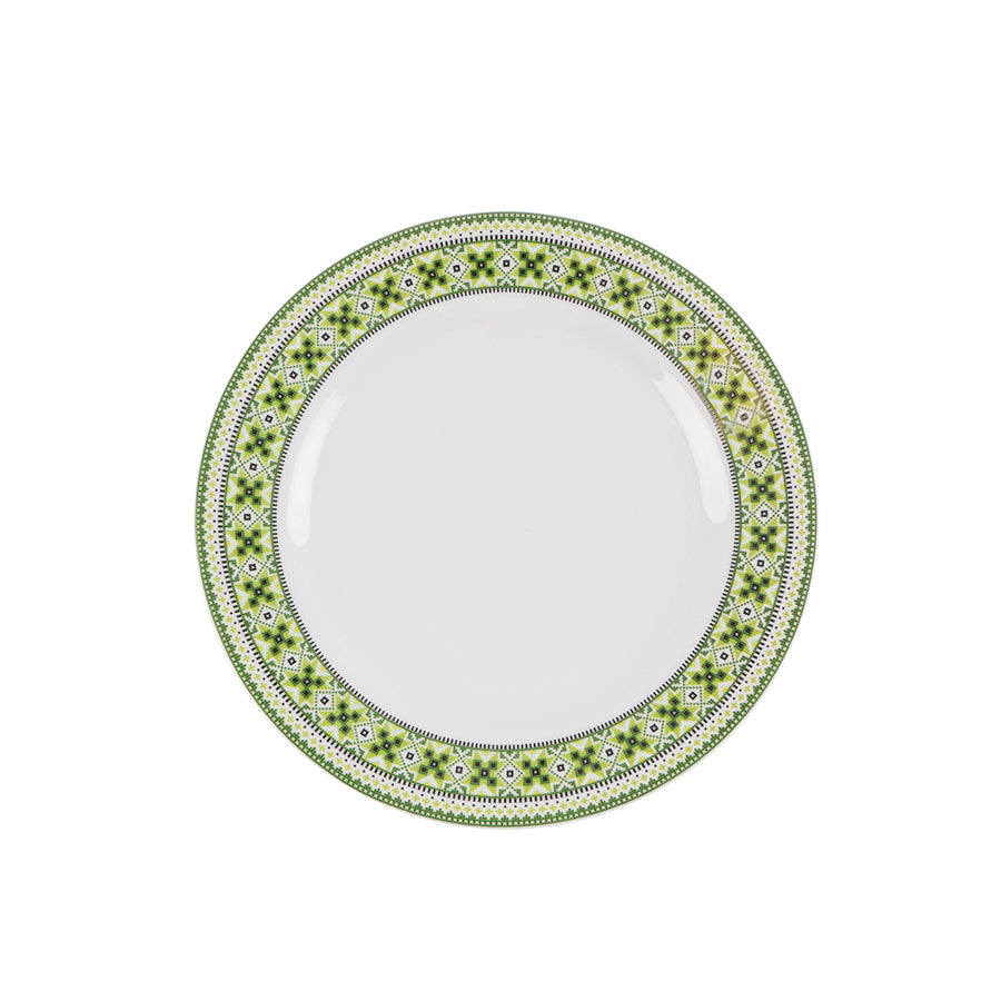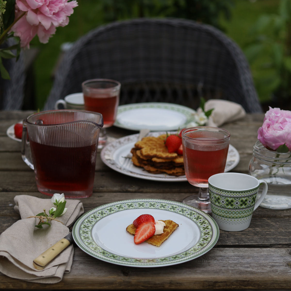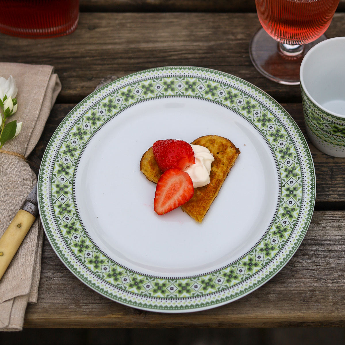 Ingrid asjett 22 cm grønn, hvor mønsteret i dekoren er moderniserte versjoner av broderier fra over 150 år gamle bunadsskjorter.