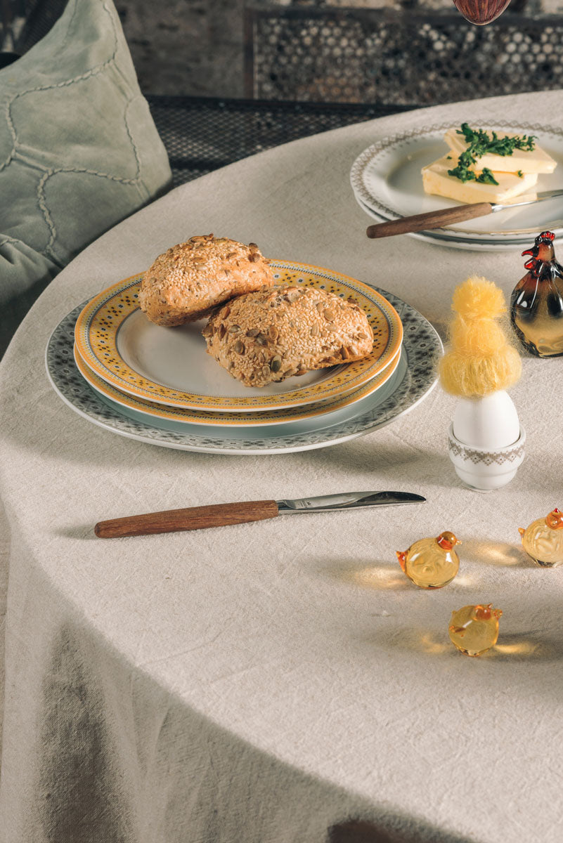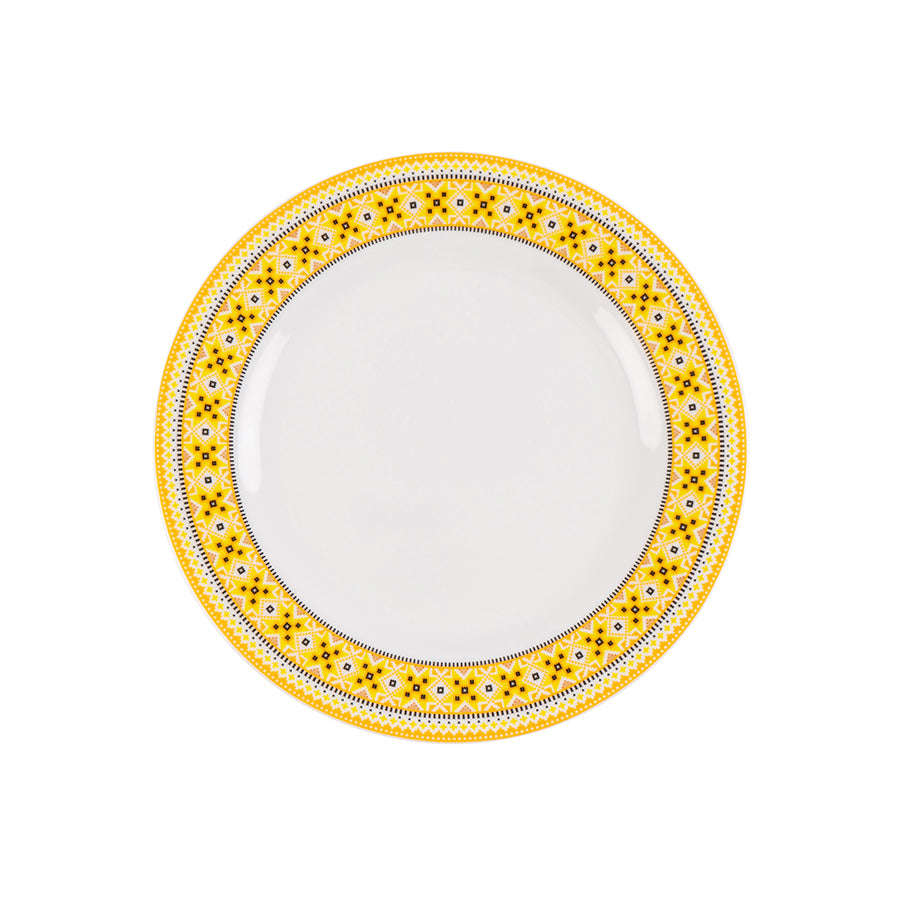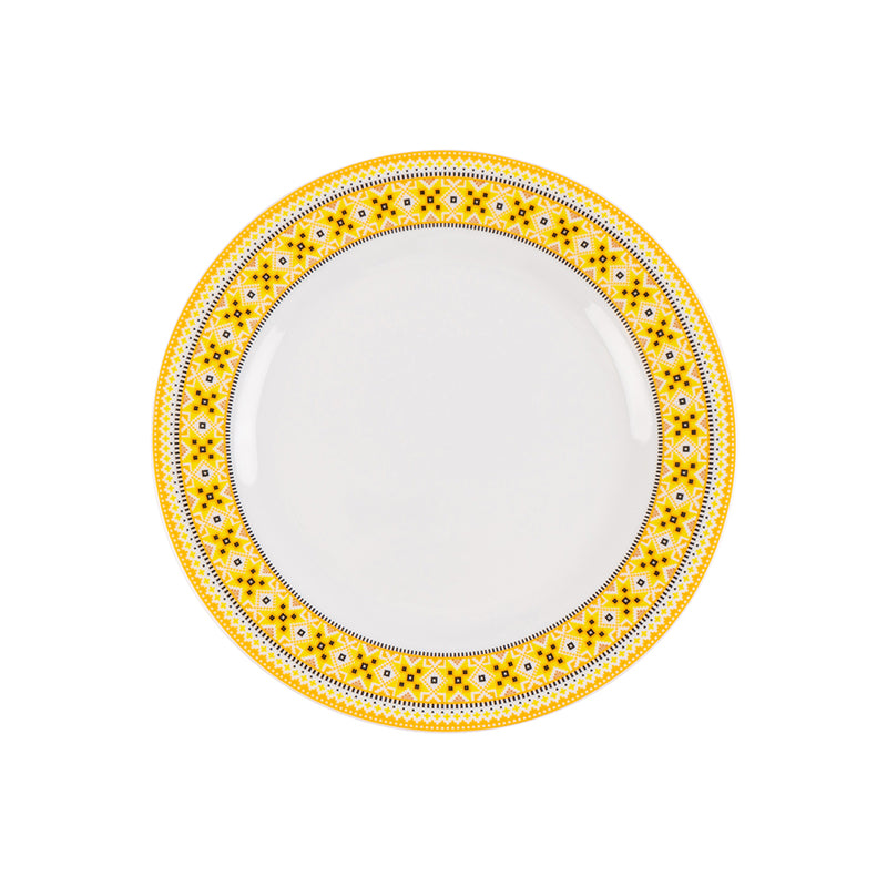 Ingrid asjett 22 cm gul, hvor mønsteret i dekoren er moderniserte versjoner av broderier fra over 150 år gamle bunadsskjorter.