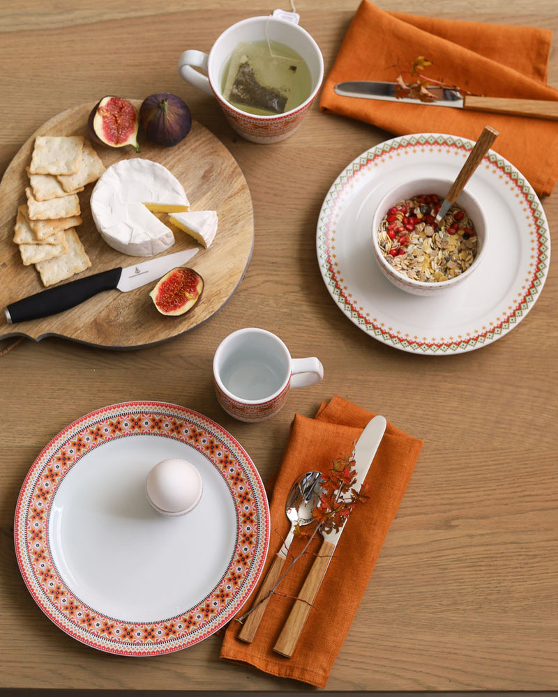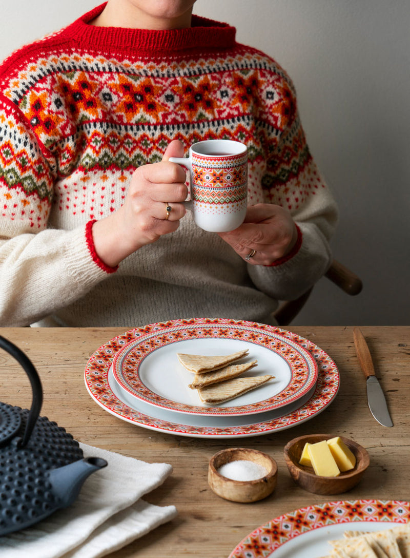 Da designer Cathrine Kirkerud utviklet dekoren til Ingrid-serviset, hentet hun inspirasjon lokalt. Med farger og mønster inspirert av skjortebroderier fra Øst-Telemarksbunaden blir dette en hyllest til norsk håndverk. Serien finner du i nedtonet og delikate gråtoner, samt i spennende fargekombinasjoner med tydelige referanser til bunadsuniverset.