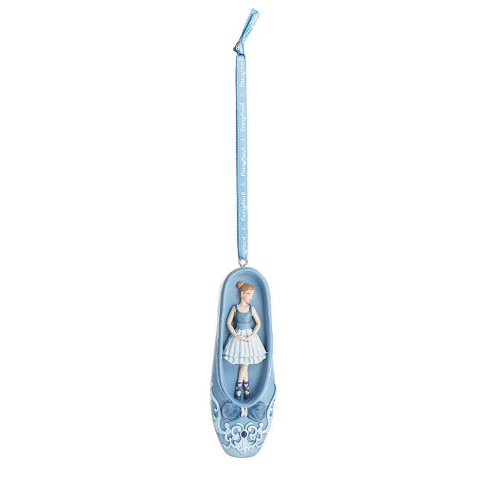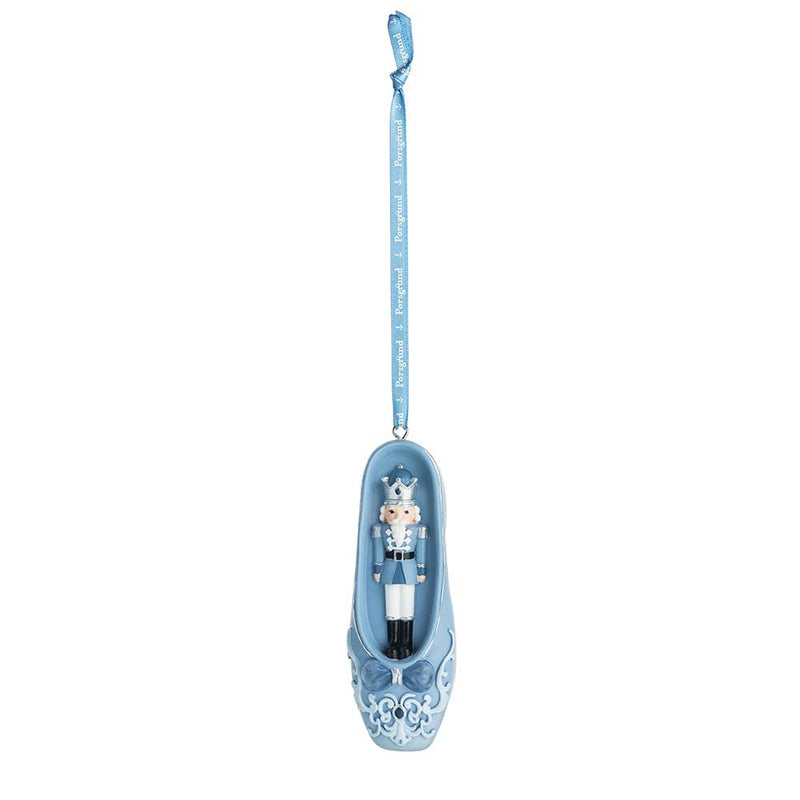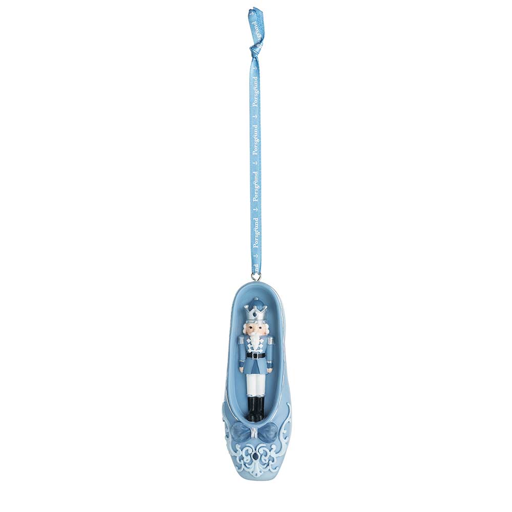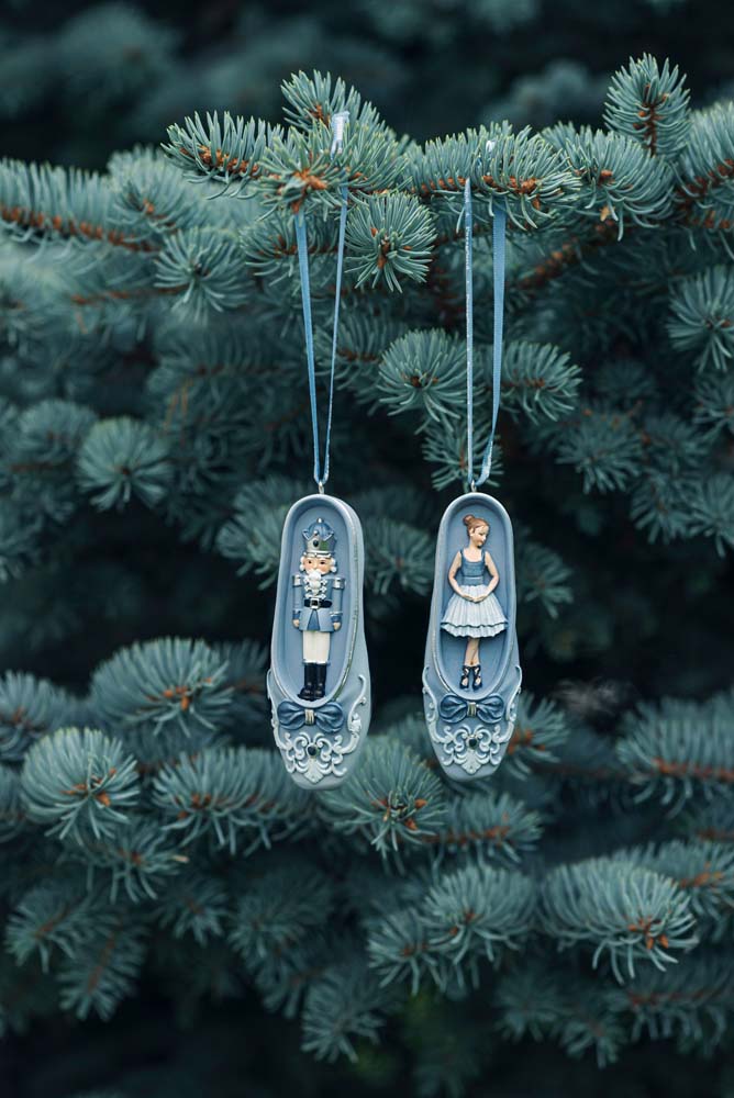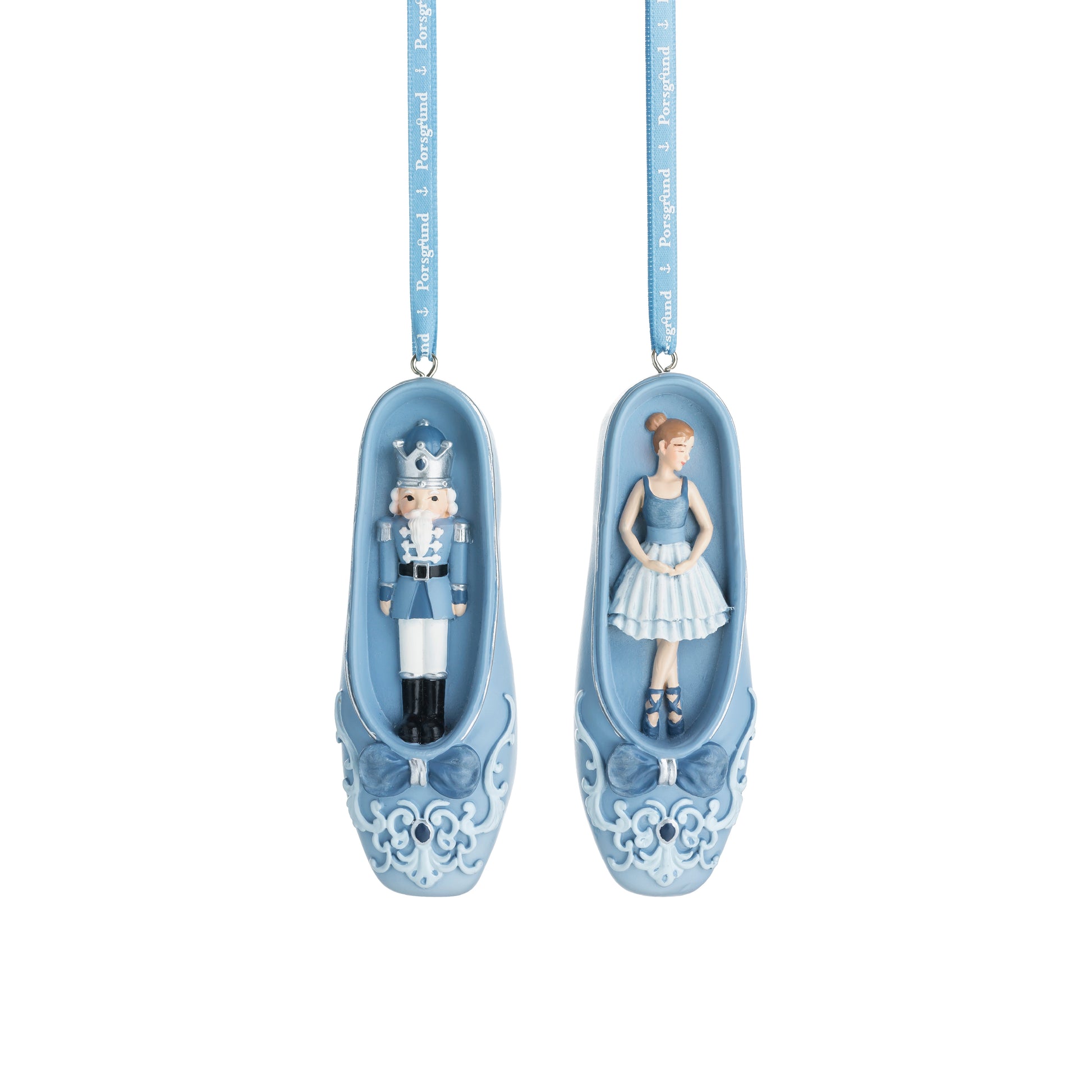 To ballettsko med detaljer fra Nøtteknekkeren – den ene med ballerina, den andre med selve Nøtteknekkeren. Perfekt pynt til juletreet for den som elsker ballett og julens magi.