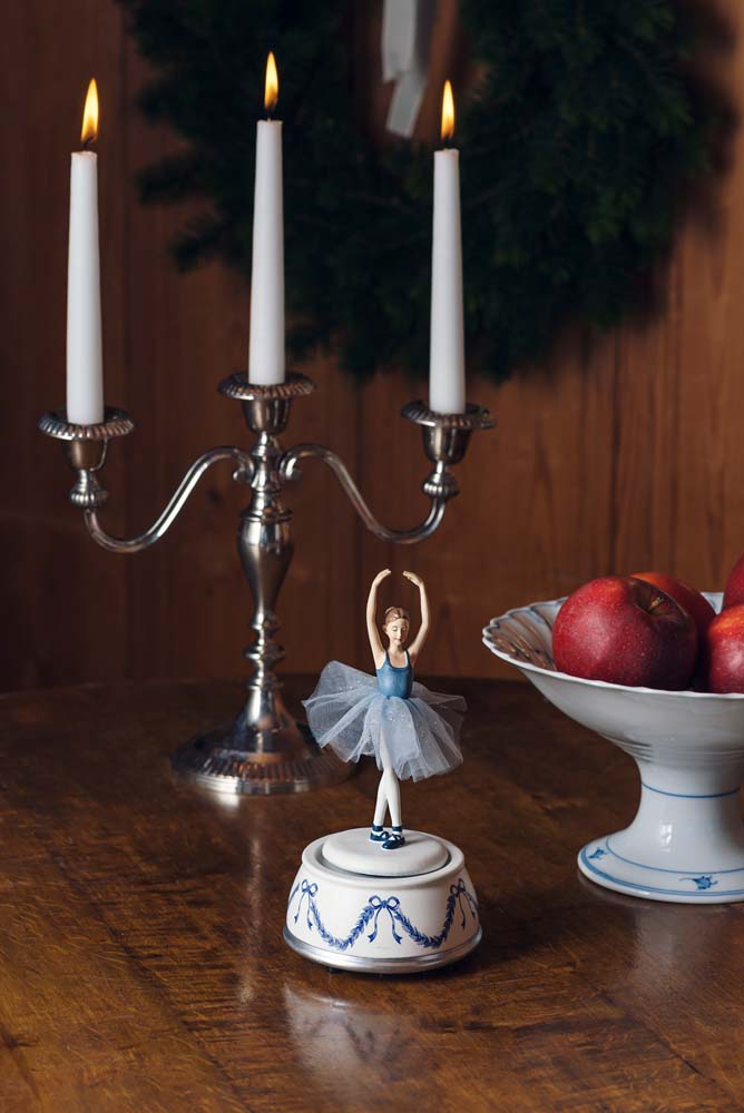 En elegant spilledåse med ballerina som danser når du trekker den opp. Dekoren i blåtoner er inspirert av Nøtteknekkeren og gir en nostalgisk, eventyrlig stemning. Perfekt som julepynt eller gave.
