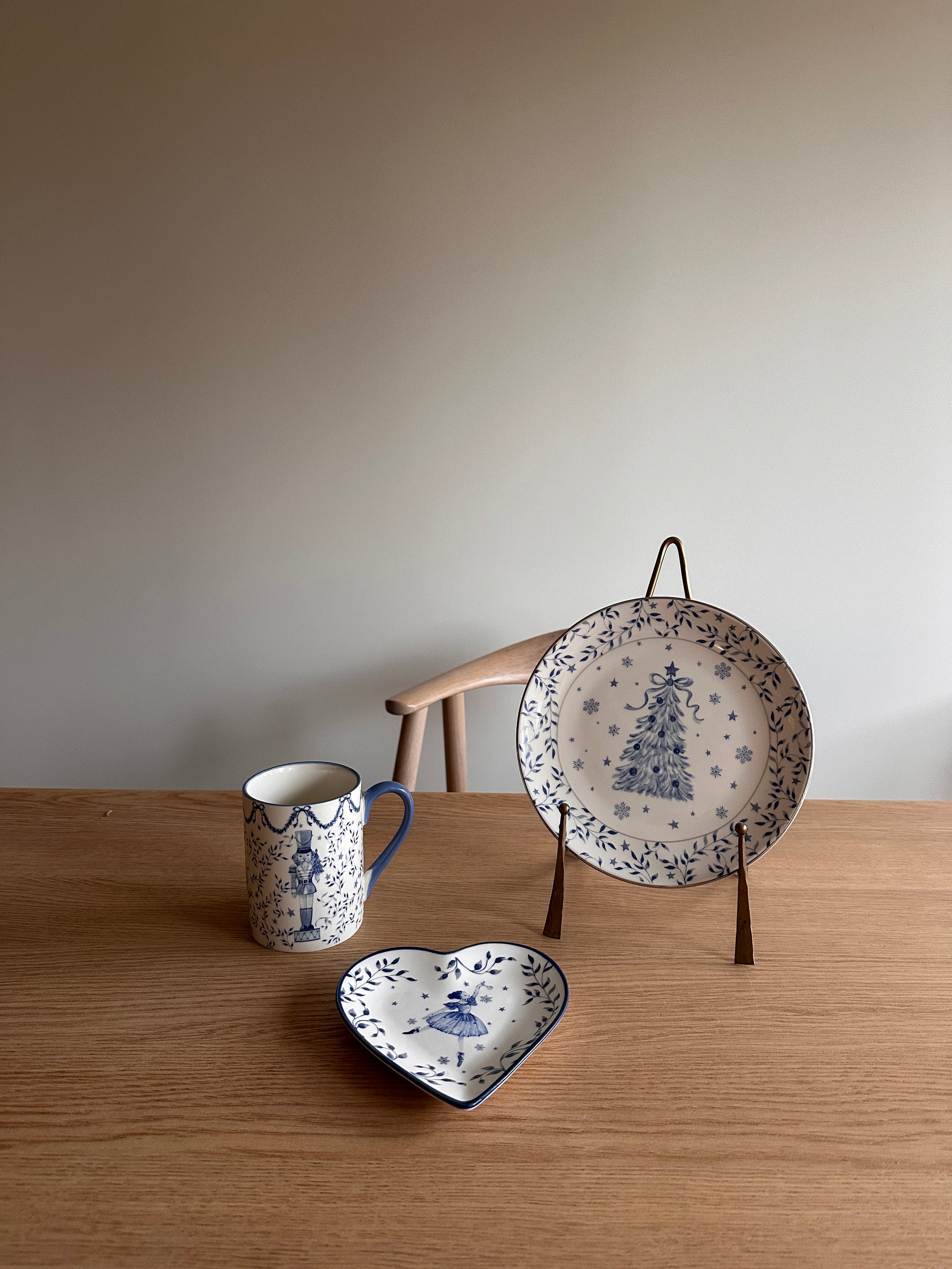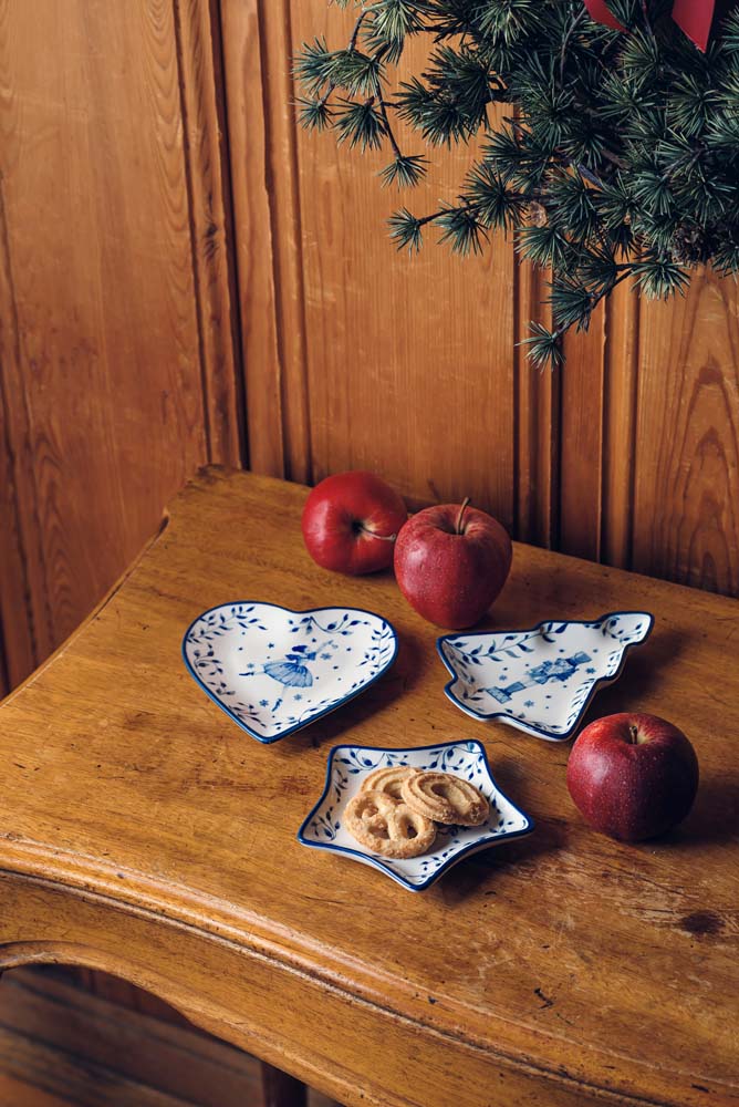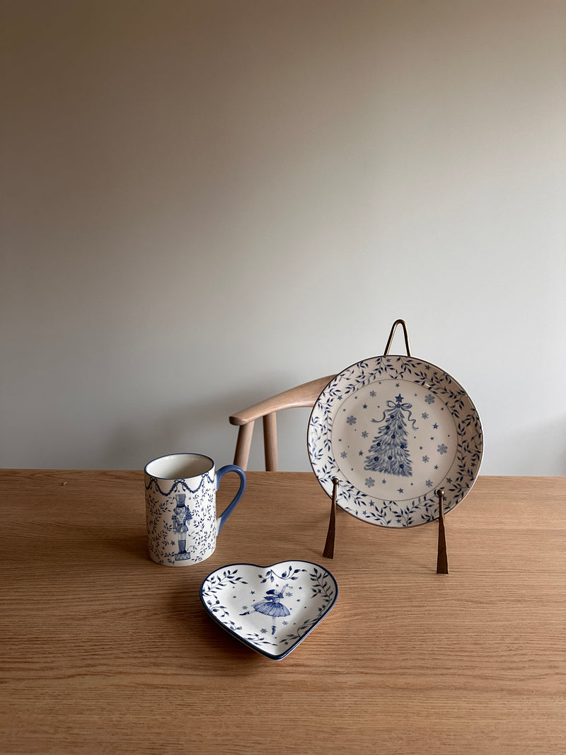 Et stort vakkert krus, perfekt for kakao, gløgg eller noe annet varmt drikke, og en asjett til frokost, lunsj eller kveldsmat. Skålen er fin til julegodter, nøtter eller småkaker for å sette stemning på julehøytiden.