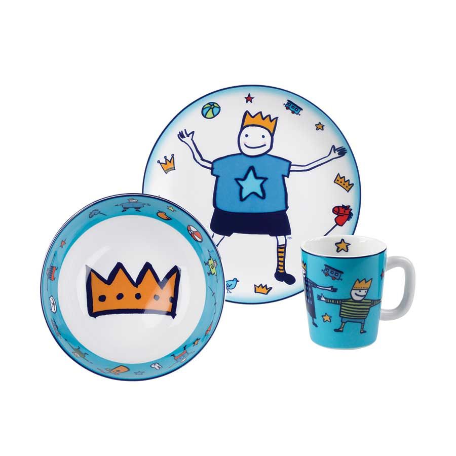 Barneservise med prinsemotiv som består av kopp, skål og asjett. Alt kan vaskes i oppvaskmaskin.