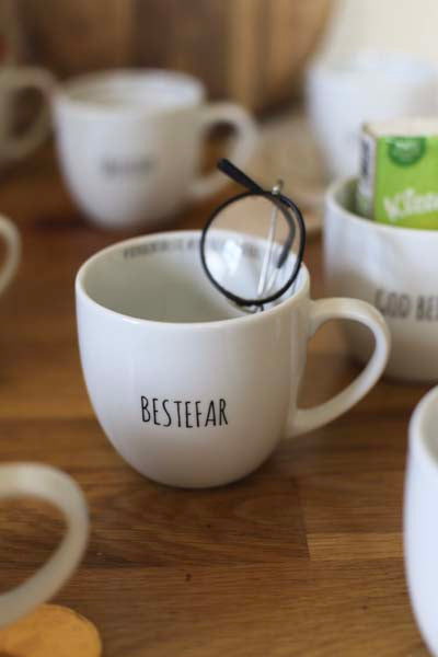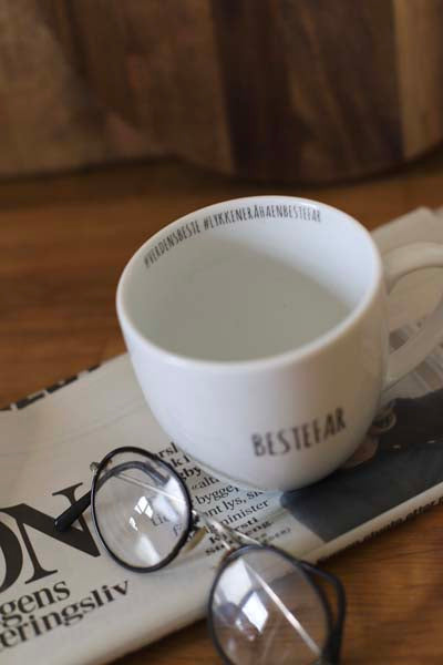 Dette kruset fra Hashtag-serien til Porsgrunds Porselænsfabrik har teksten «Bestefar» i front. På innsiden skjuler det seg to varme hashtags: #verdensbeste og #lykkeneråhaenbestefar