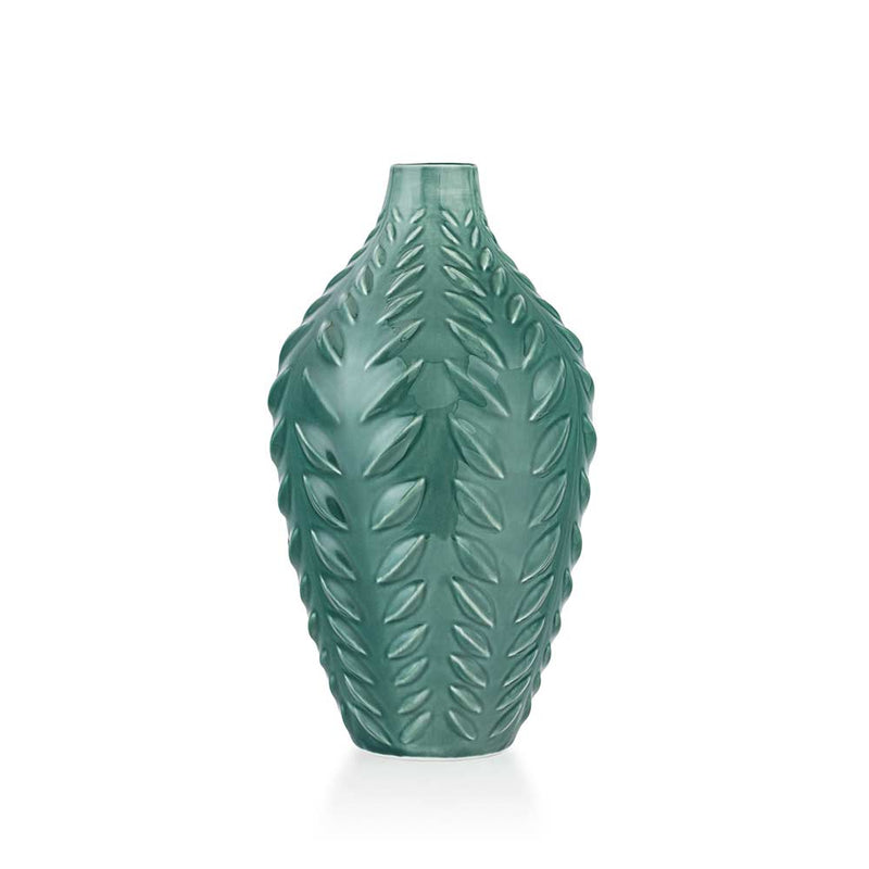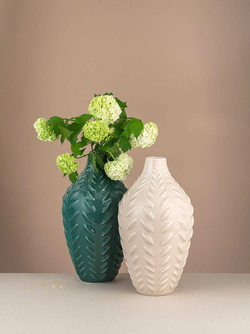 Med sin karakteristiske silhuett, smal hals og formfulle kropp, fremhever vasen blomster, kvister og grener på en elegant måte. Det bladformede relieffet gir en unik og dekorativ struktur som gjør den til et blikkfang i ethvert rom.