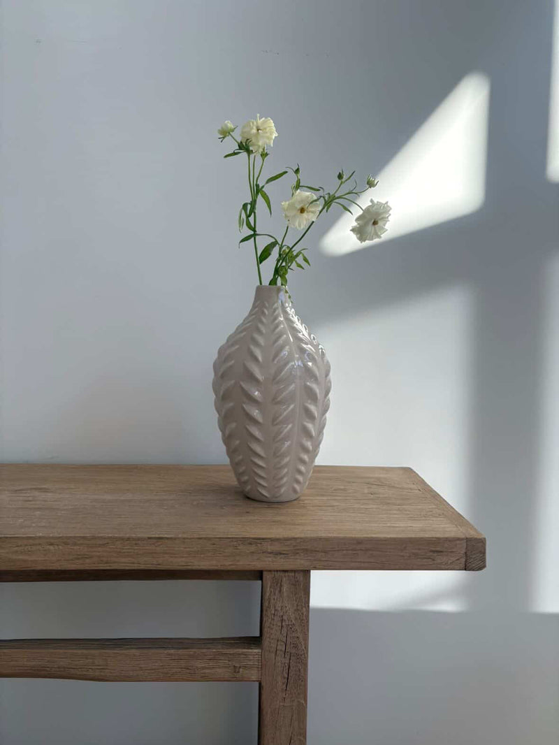 Det elegante bladrelieffet gir vasen en unik struktur og gjør den til et dekorativt smykke i hjemmet. Den lyse kremfargen gir et tidløst og sofistikert uttrykk som passer perfekt inn i både klassiske og moderne interiører.