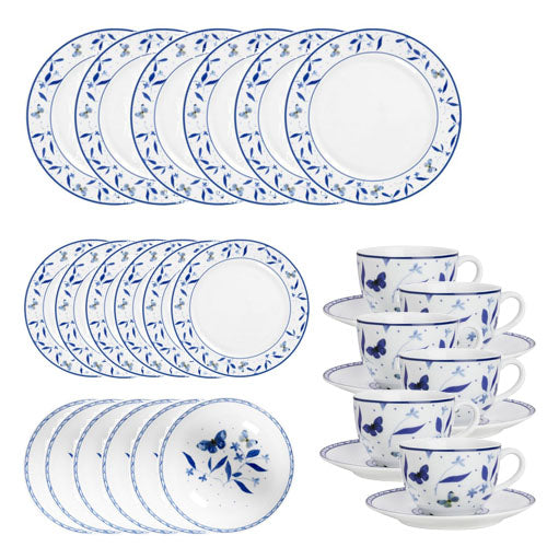 I denne servisepakken kan du dekke bordet til 6 personer med det flotte serviset Bluebird. I denne pakken får du flate tallerkner, skåler og kopper med skåler.