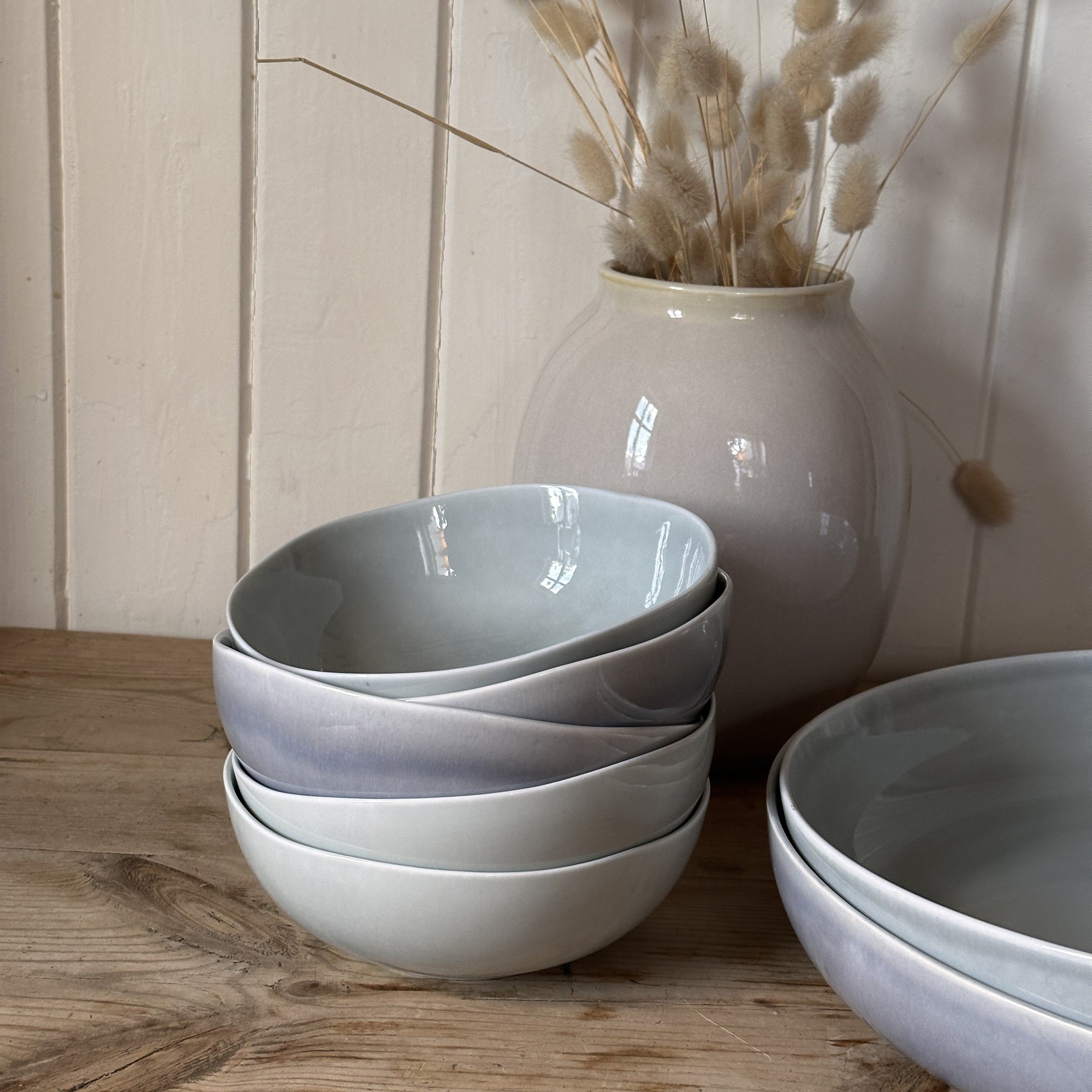 Bolle 17 cm i fargen Dusty Blue er en elegant serveringsskål fra Ellie-serien. Den tåkeblå tonen gir bordet en rolig og sofistikert atmosfære, ideell for salater, snacks eller desserter. Ujevne kanter og reaktiv glasur gir bollen et unikt og naturlig uttrykk.