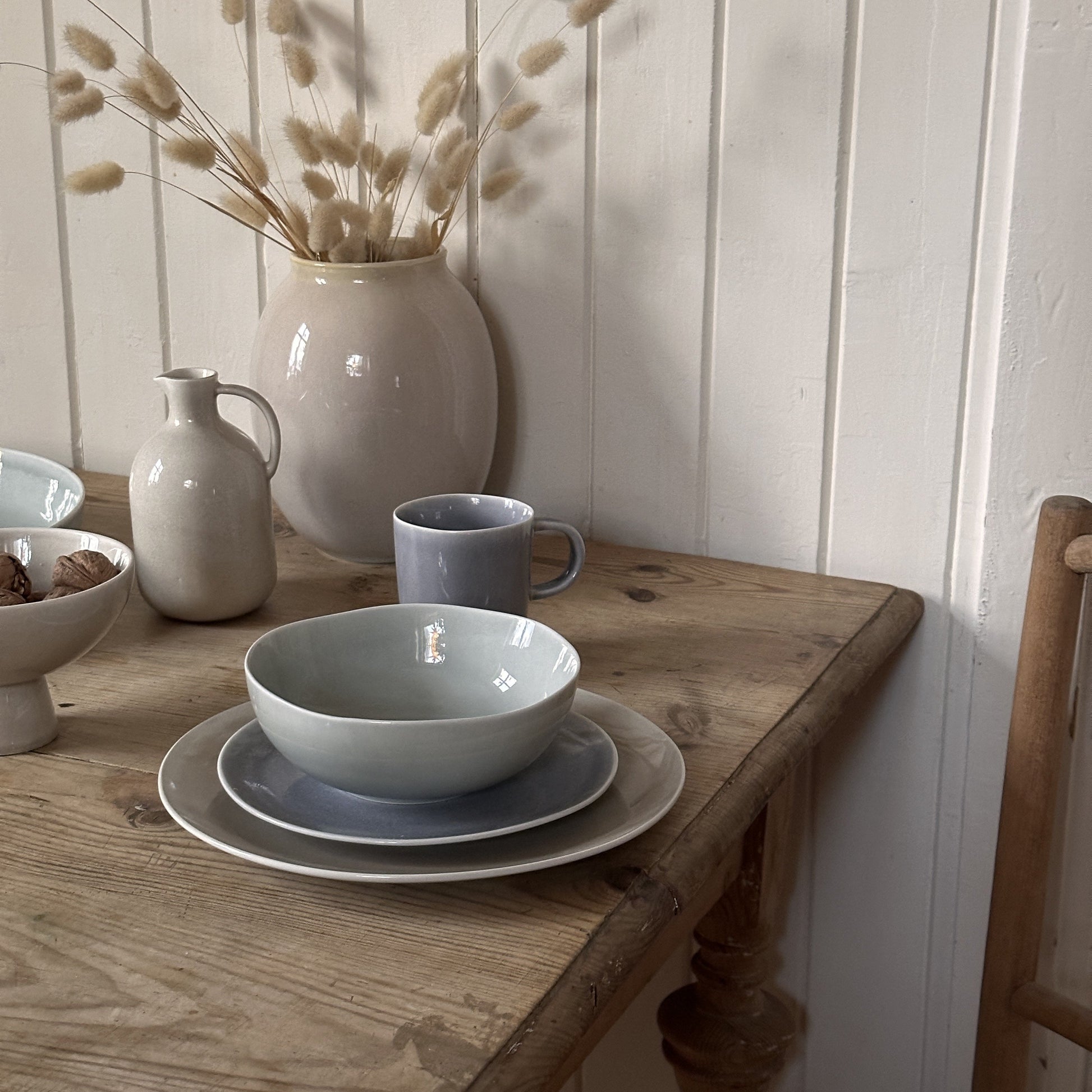 Ellie-serien er kjent for sitt tidløse design og reaktive glasur, som gir hver del unike fargenyanser. Kombiner bolle 17 cm Dusty Green med andre deler i serien for en harmonisk og stilfull borddekking, perfekt til både hverdag og fest.