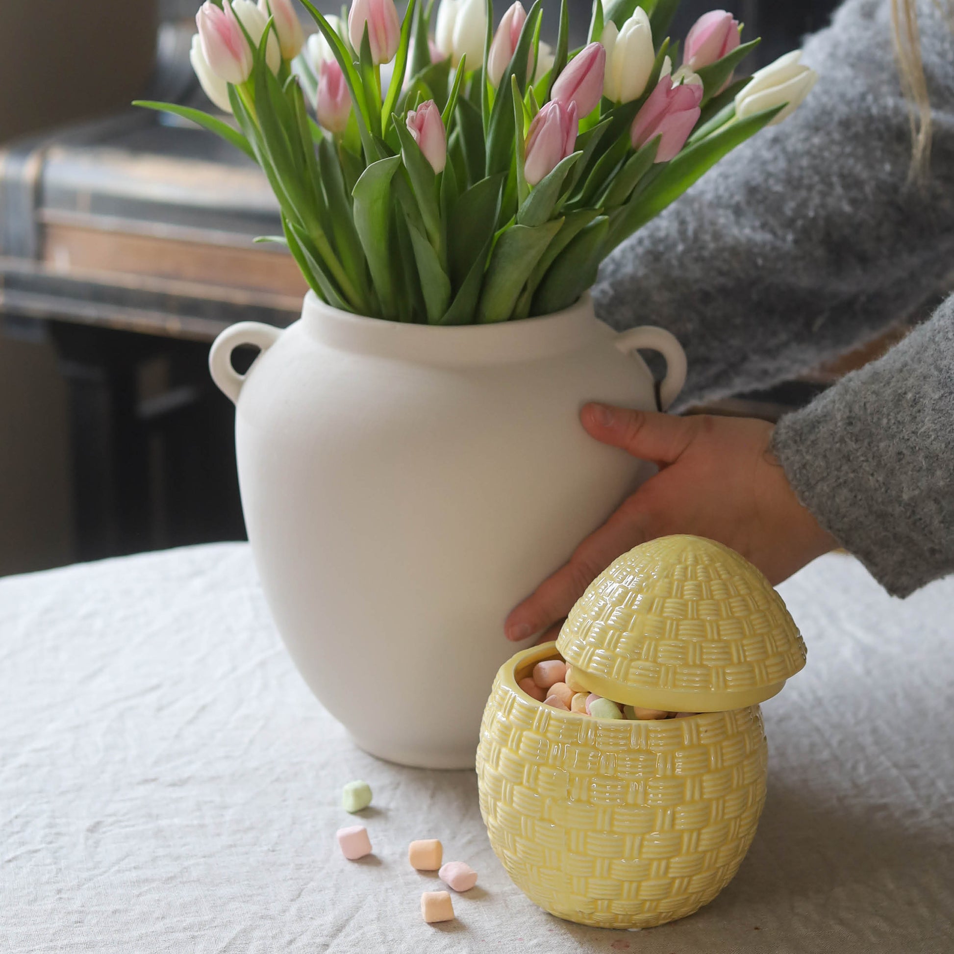 Krukken er laget av keramikk, kjent for sin holdbarhet og skjønnhet. Tørkes forsiktig av med en myk klut for å bevare overflaten.