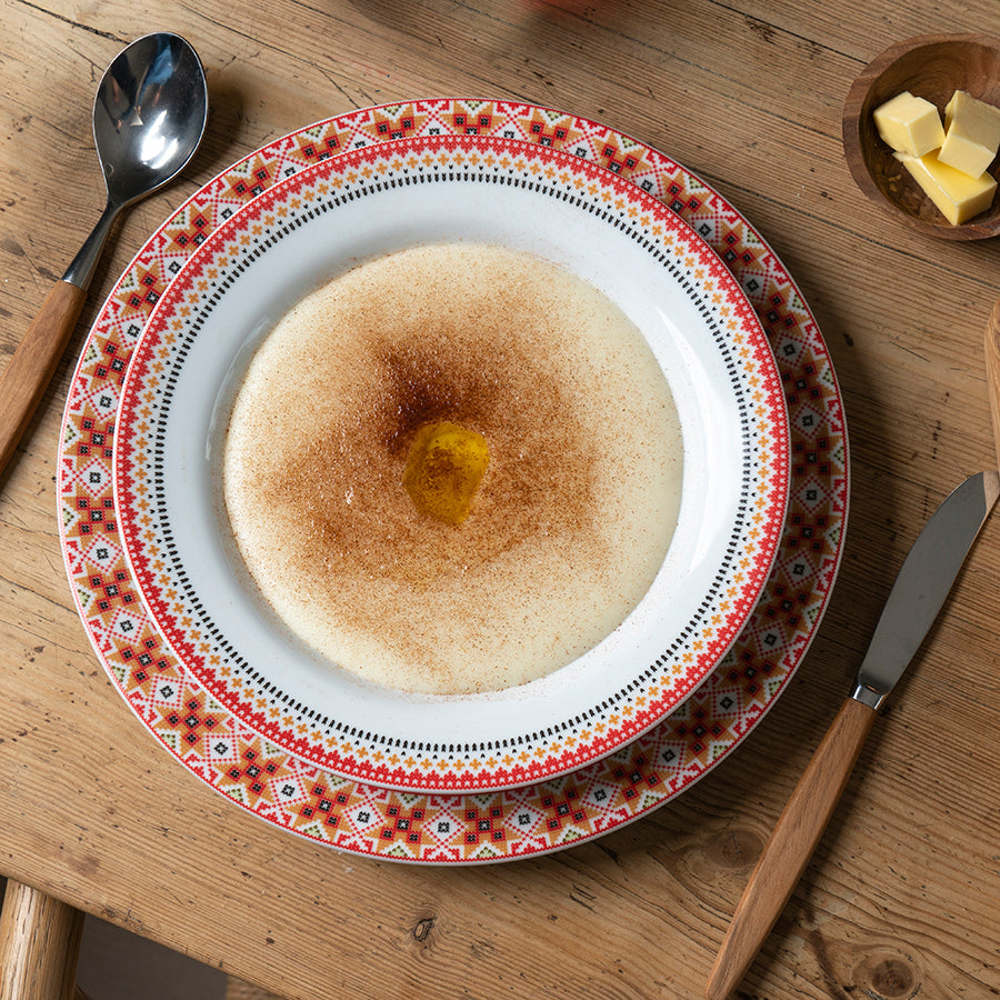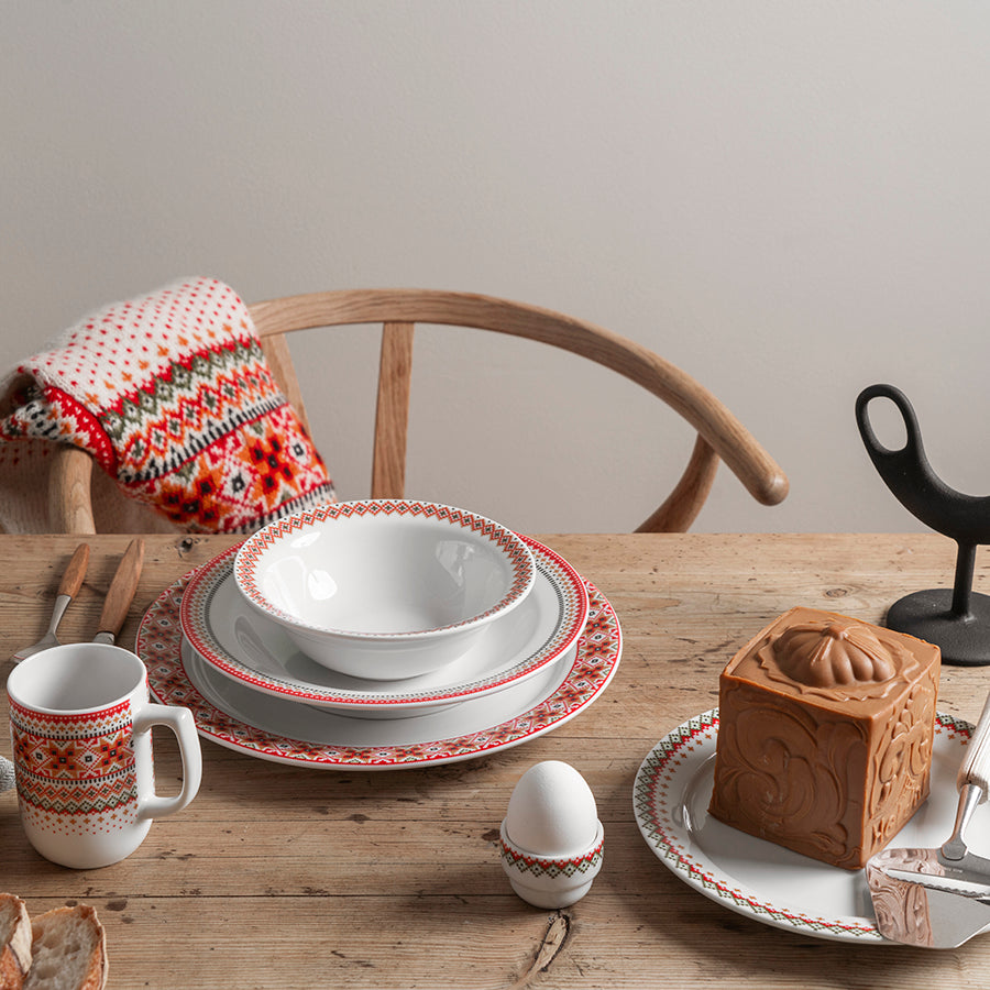 Da designer Cathrine Kirkerud utviklet dekoren til Ingrid-serviset, hentet hun inspirasjon lokalt. Med farger og mønster inspirert av skjortebroderier fra Øst-Telemarksbunaden blir dette en hyllest til norsk håndverk. Serien finner du i nedtonet og delikate gråtoner, samt i spennende fargekombinasjoner med tydelige referanser til bunadsuniverset.