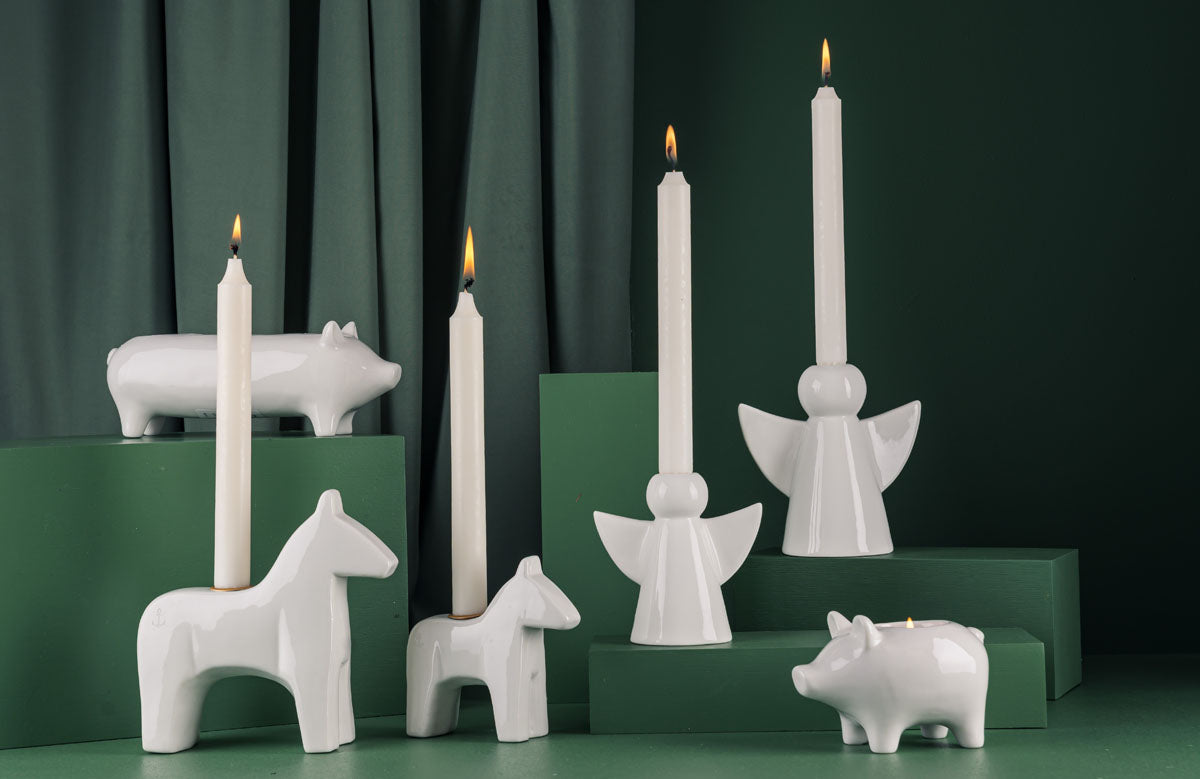 Hvorfor ikke gå for hvit jul i år? Dølahesten lysestaker skaper en varm og koselig atmosfære i den skjønne juletiden. Settet kommer med to lysestaker, hvor den ene er 16,5 cm høy, og den andre 12 cm høy. Begge lysestakene er elegant utformet som Dølahester og er laget i hvitt porselen.
