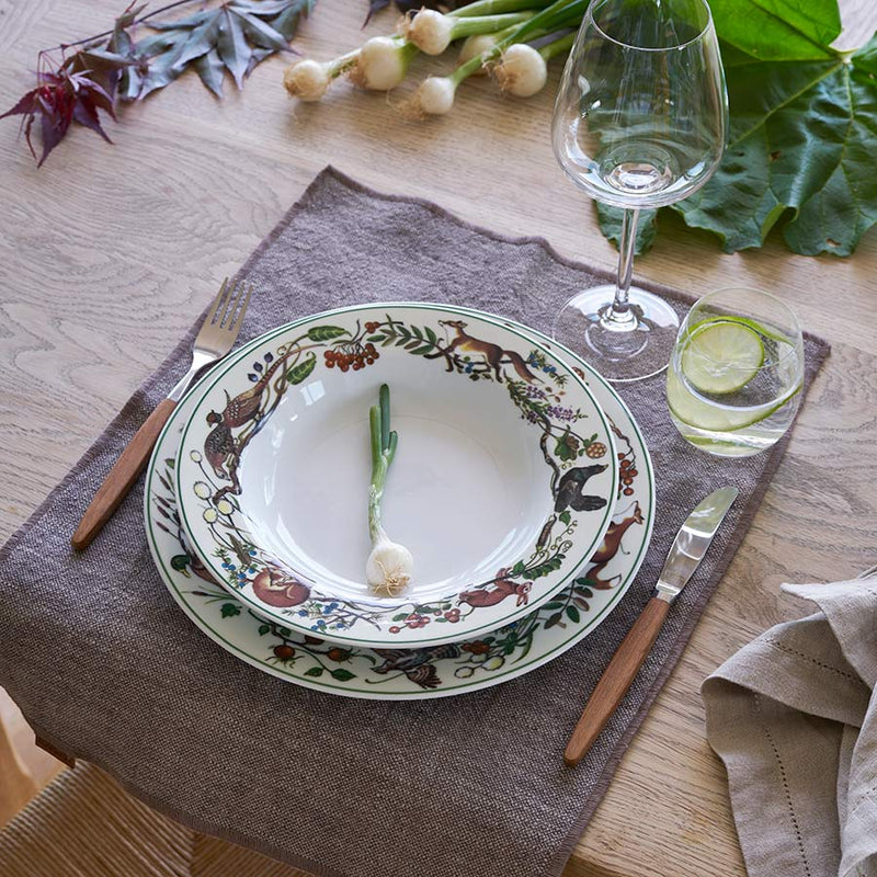 Faunamønsteret ble unnfanget da illustratør Astrid Reppe var på tur i den norske villmarka. Den norske faunaen med sin ville, uberørte, natur ble til et flott og robust design der både rev, hare og rype finnes mellom einebær og andre ville planter. Serviset ble lansert i 1998 Har du hytte på fjellet eller driver du med jakt? Fauna er det perfekte serviset når gode viltretter serveres! Høybrent feltspatporselen er den porselenskvaliteten Porsgrunds Porselænsfabrik har produsert siden 1887, altså fra begynnelsen. Det høybrent porselenet regnes som den edleste kvaliteten av porselen og kjennetegnes ved at det er gjennomskinnelig hvitt med en klar glansfull glasur. Høybrent porselen består kun av rene naturmaterialer, er 100% tett, svært robust og er velegnet til både fest, og hverdagsbruk.