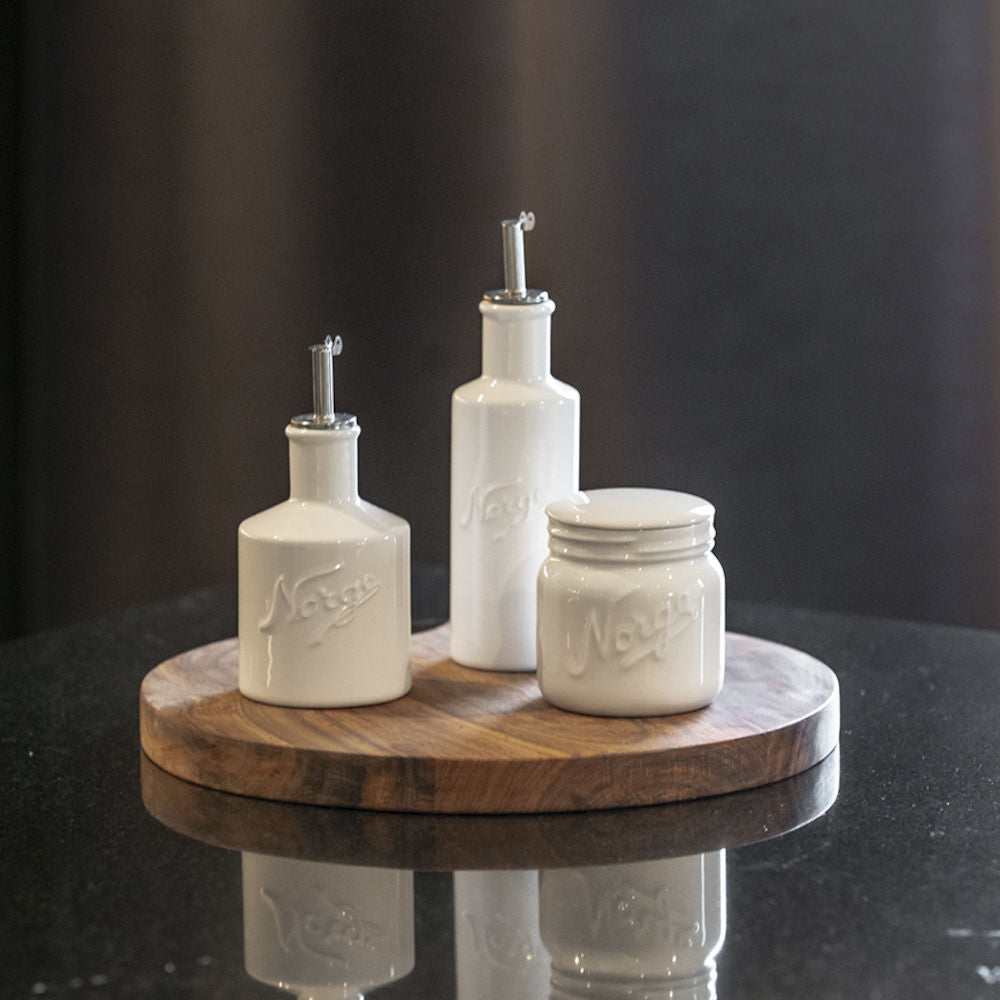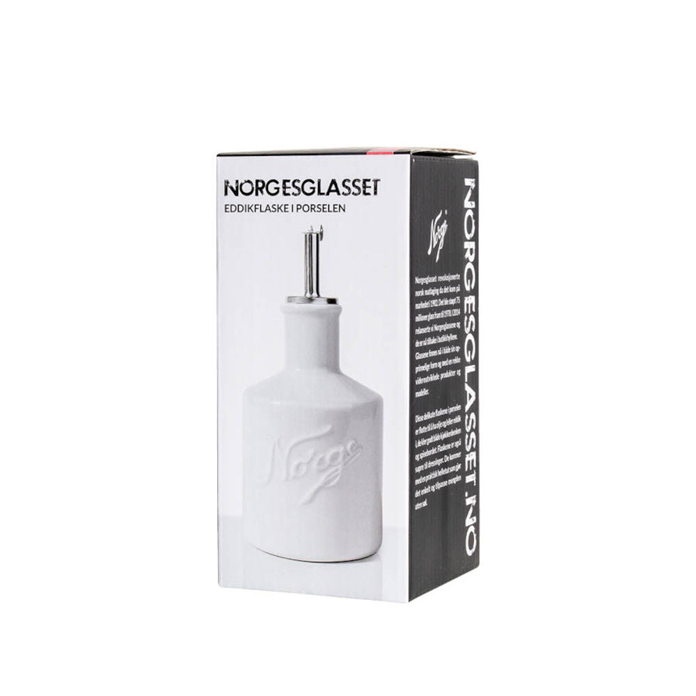 Hvite porselensflasker med Norge logo til eddik og dressinger. Flasken rommer 2,5dl og gjør seg like godt på spisebordet som på kjøkkenbenken. Passer godt sammen med Oljeflasken i porselen.