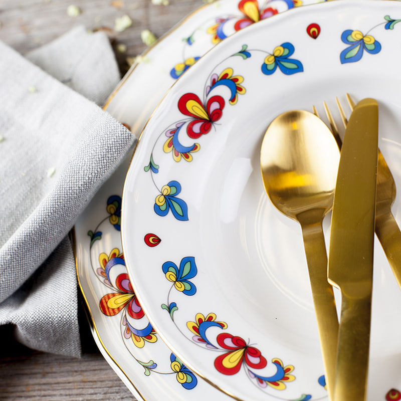 Oppvaskmaskin: Serviser med overglasurdekorer, spesielt gull og platina, er mer utsatt for slitasje og vi anbefaler derfor oppvask for hånd. Generelt anbefaler vi skånsom vask og bruk av glansemiddel, da opprettholdes glasurens glans og du forlenger servisets levetid. ikrobølgeovn: Artikler med gull eller platinadekor må ikke brukes i mikrobølgeovn. Ovn: Vi anbefaler ikke at du setter porselensartikler med gull eller platinadekor i ovnen.