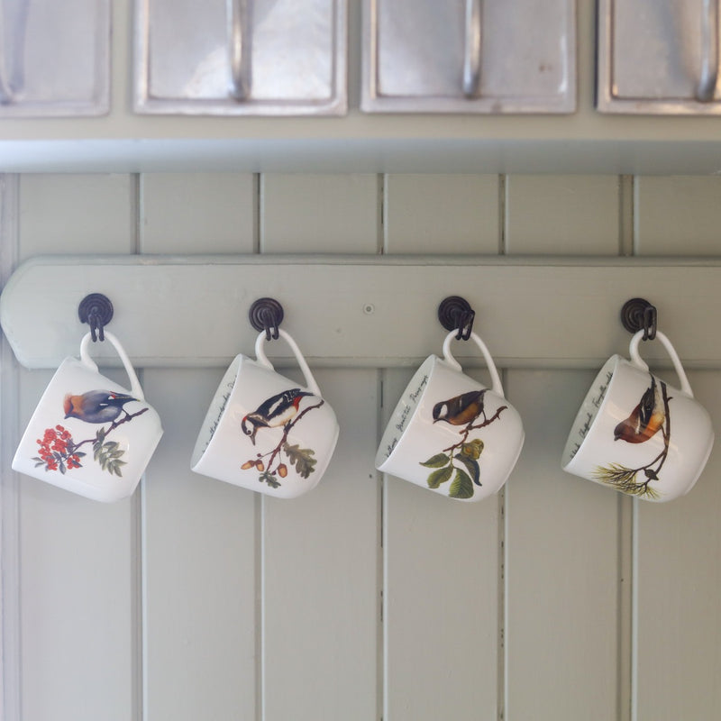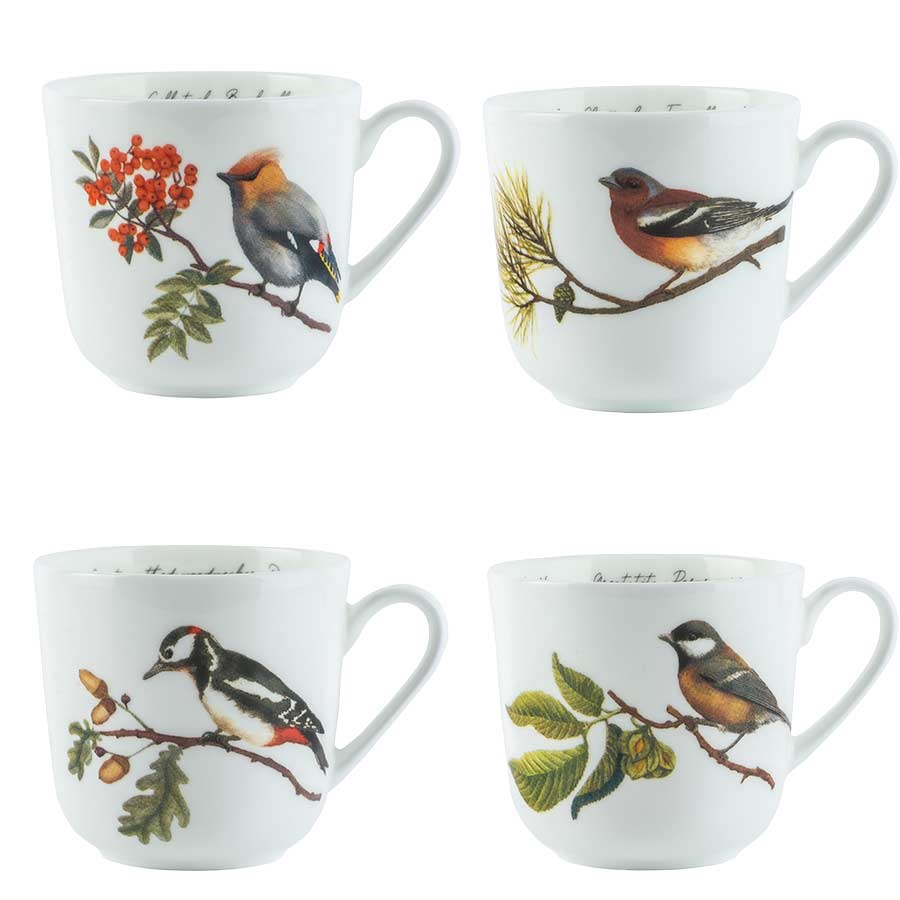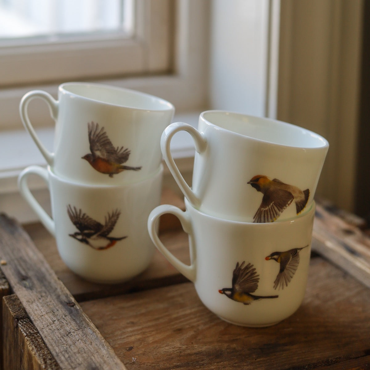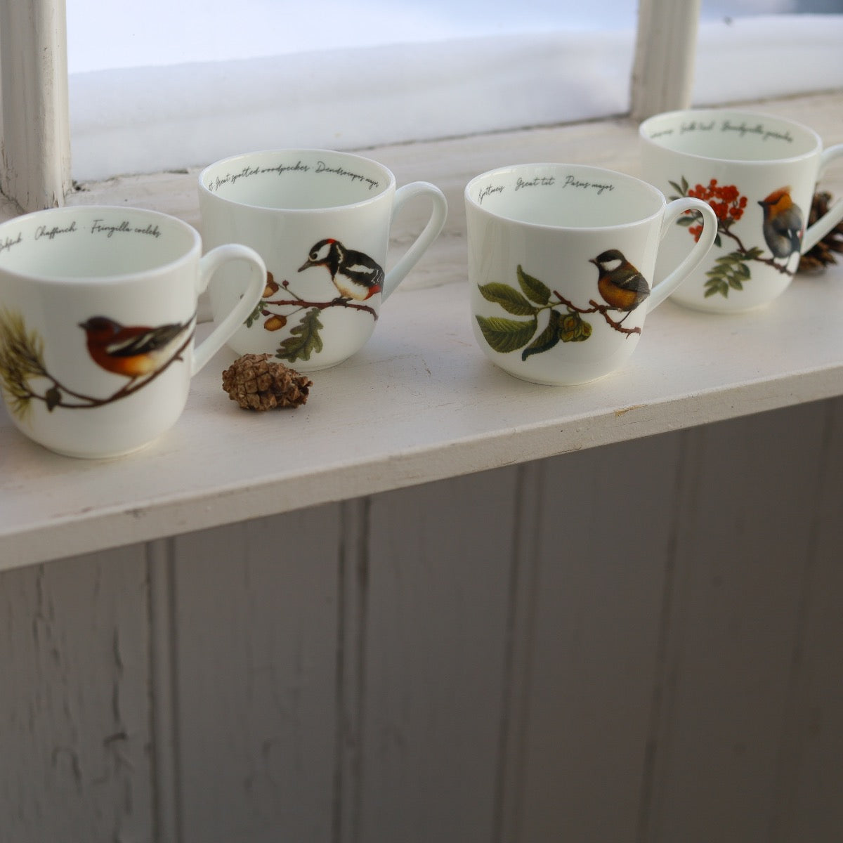 Her får du de fire ulike fuglekrusene med akvareller malt av vår designer Cathrine Kirkerud.