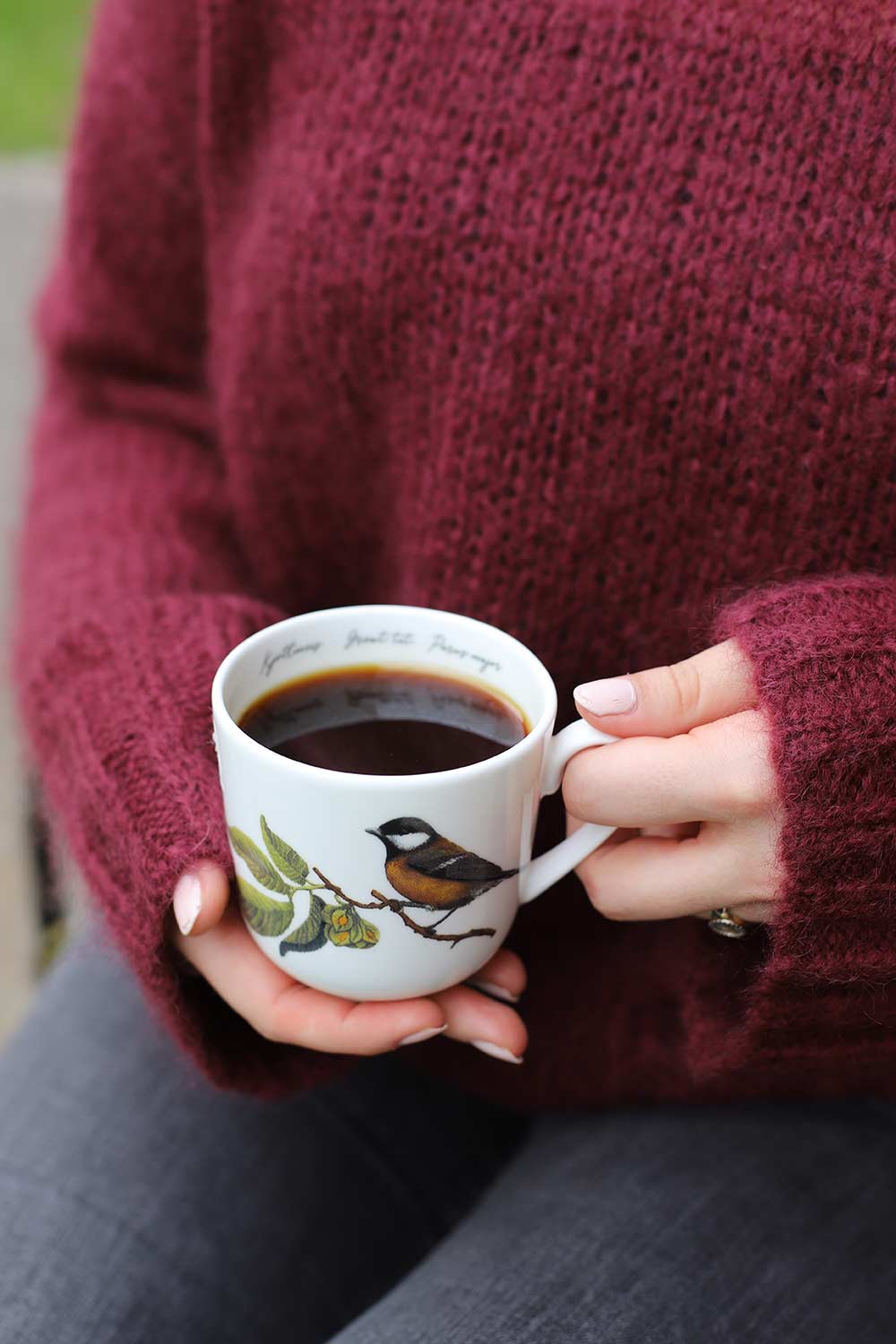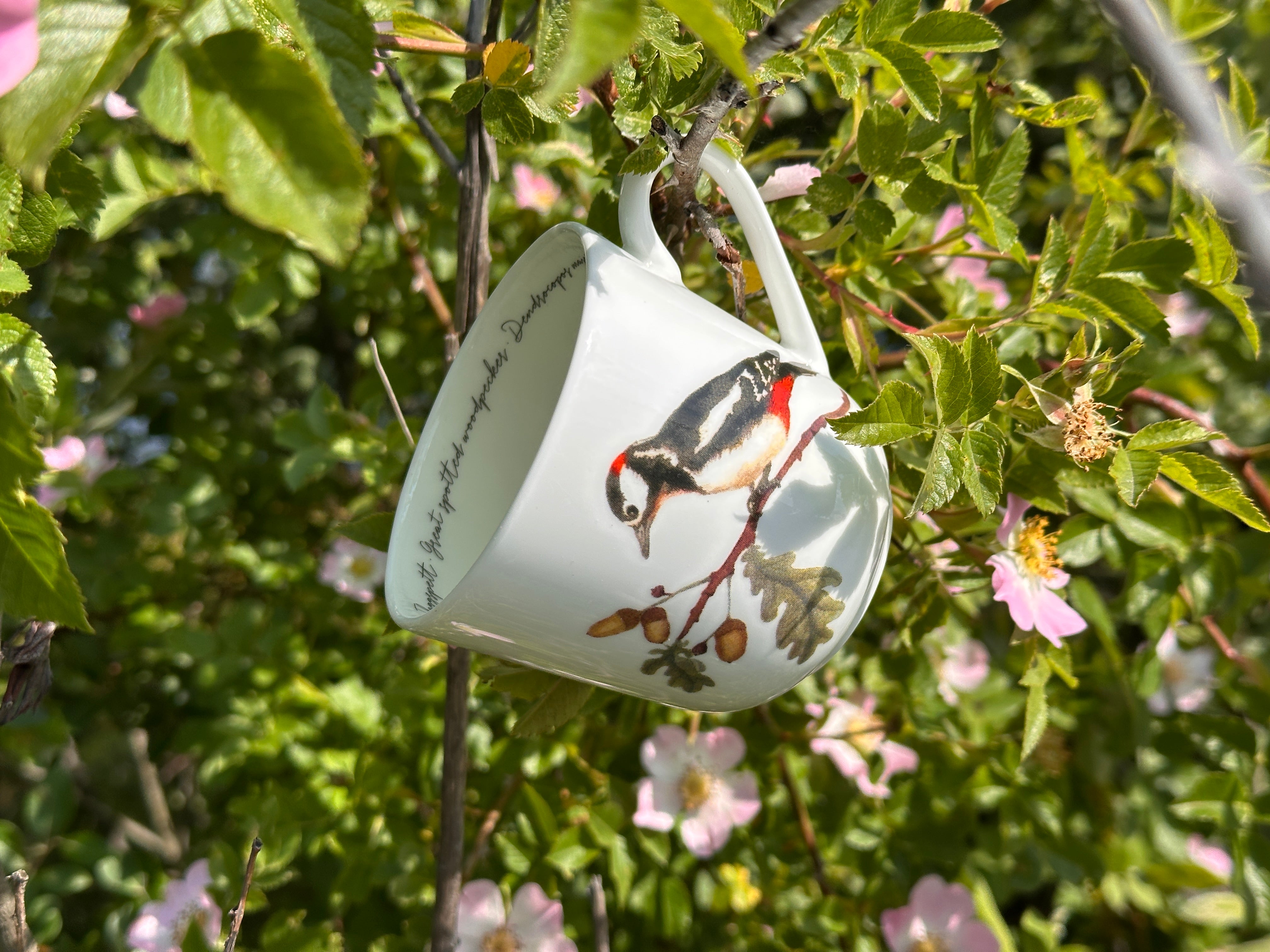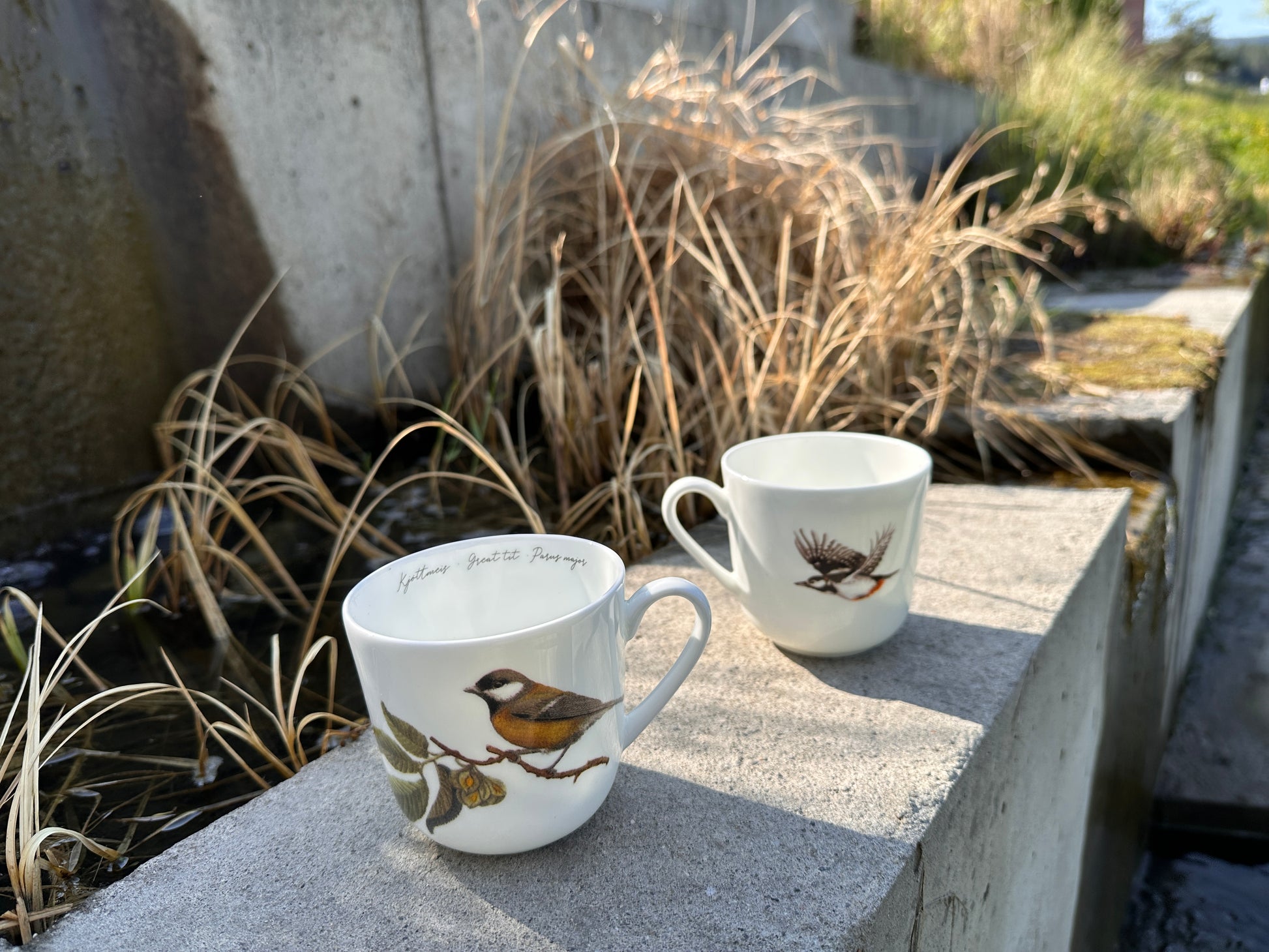 Hvert krus rommer 30 cl og har fuglens navn skrevet på norsk, latinsk og engelsk inni. Motivene, malt i akvarell av Cathrine Kirkerud, fanger fuglenes unike sjarm og viser dem både sittende på grener og i flyvende bevegelse.