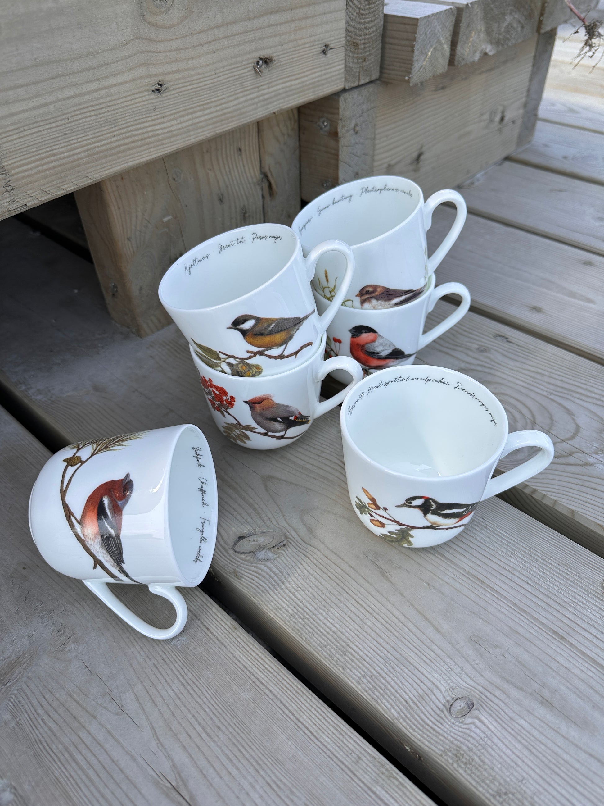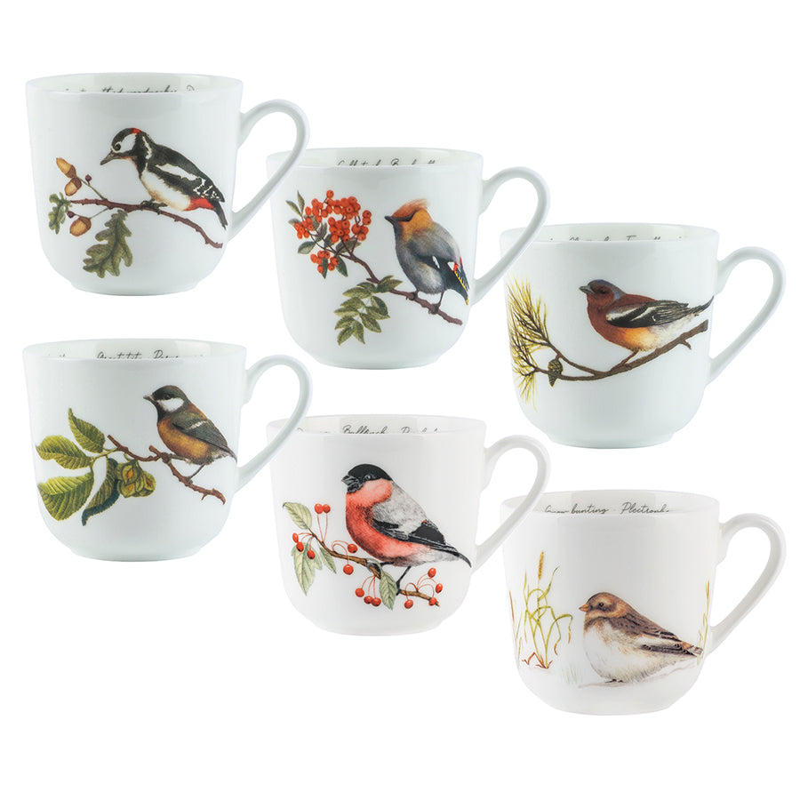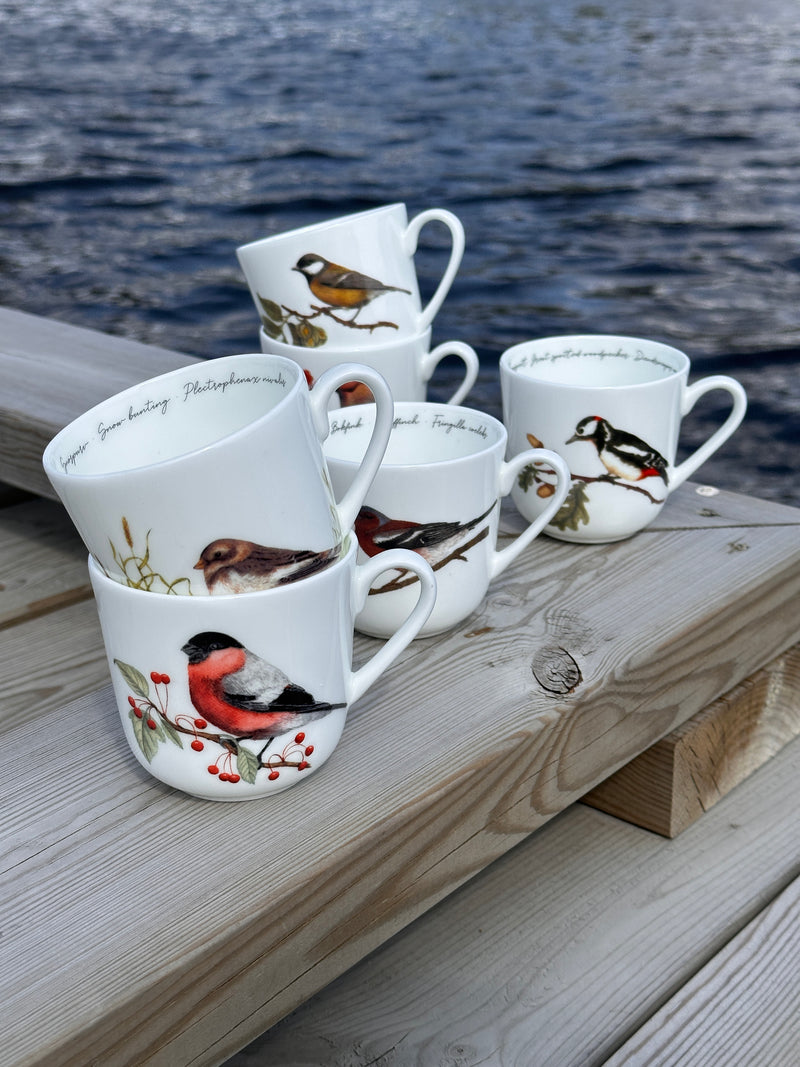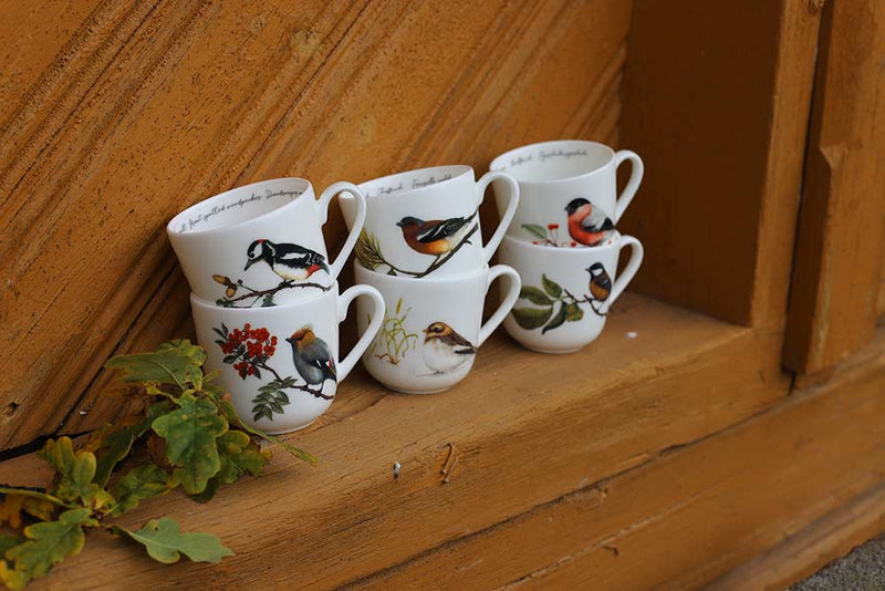 En samling av våre seks elegante fuglekrus i tynn benporselen, med motiver av noen av Norges mest kjente og kjære fugler: Sidensvans, Kjøttmeis, Flaggspett, Bokfink, Dompap og Snøspurv.