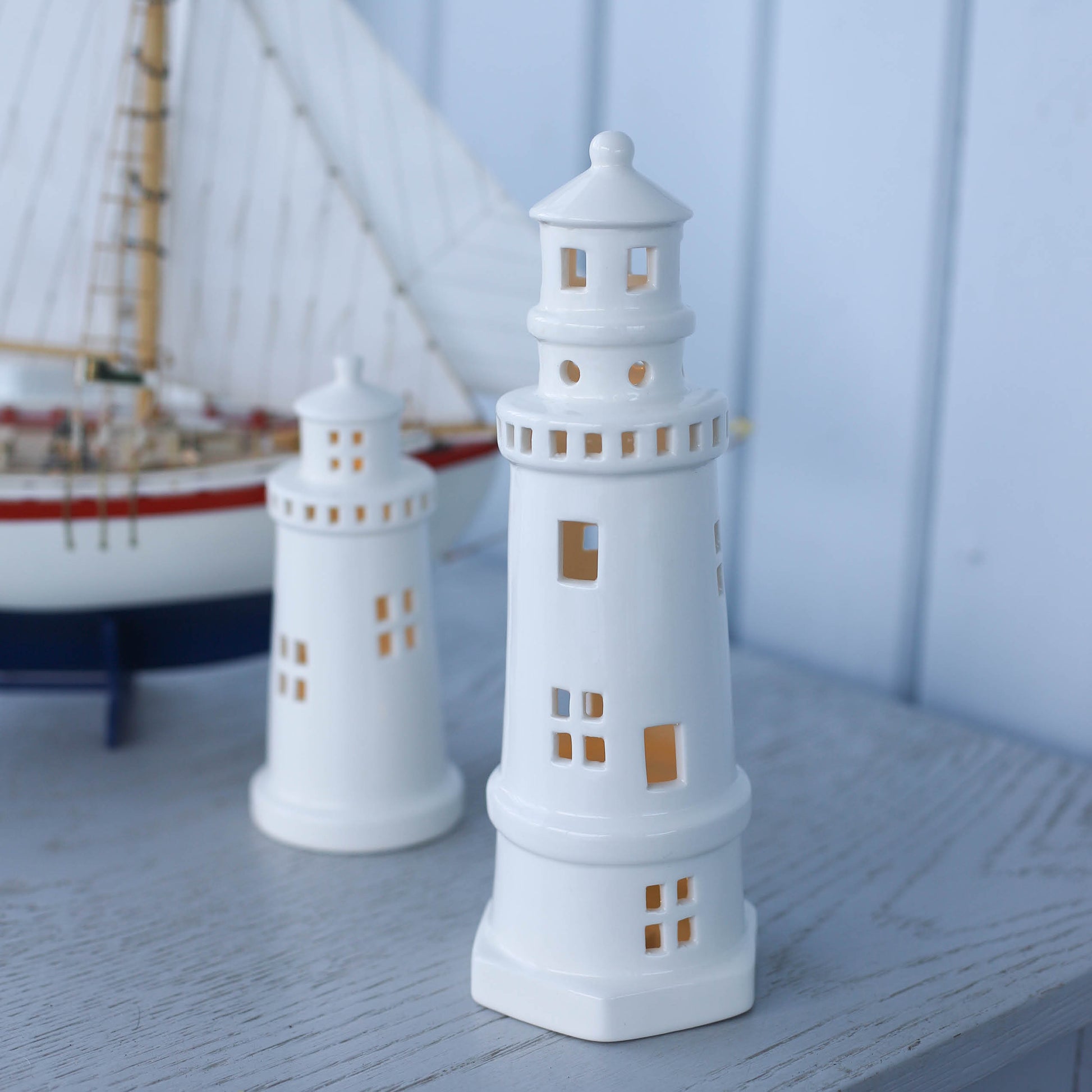 Stort og dekorativt fyrtårn i porselen med innebygd LED-lys. Den klassiske hvite fargen og detaljerte designet gir en stilren, maritim stemning som passer perfekt til hjemmet, hytta eller uterommet. Plasser det i vinduet, på bordet eller en hylle for å lyse opp mørke kvelder.