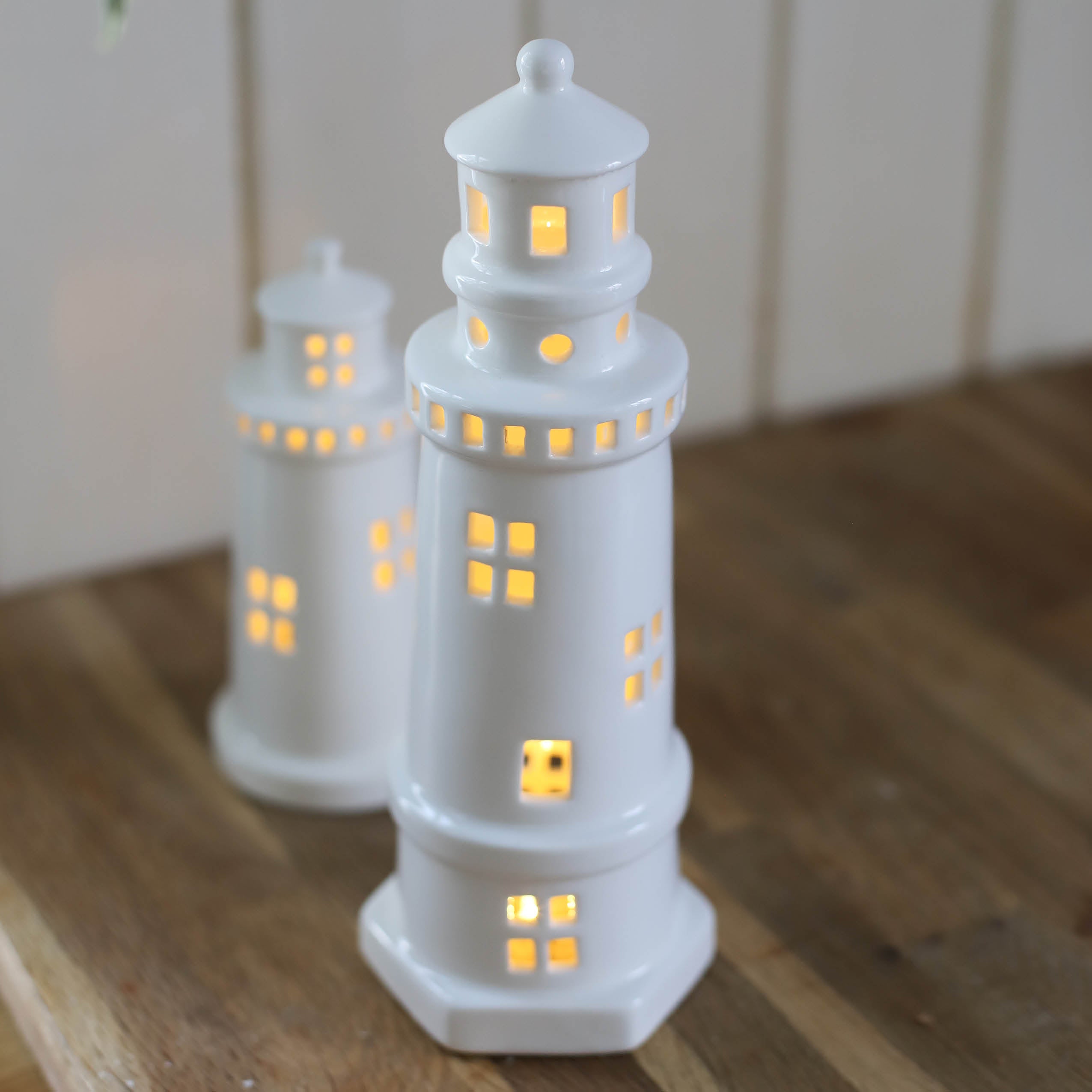Stort og dekorativt fyrtårn i porselen med innebygd LED-lys. Den klassiske hvite fargen og detaljerte designet gir en stilren, maritim stemning som passer perfekt til hjemmet, hytta eller uterommet. Plasser det i vinduet, på bordet eller en hylle for å lyse opp mørke kvelder.